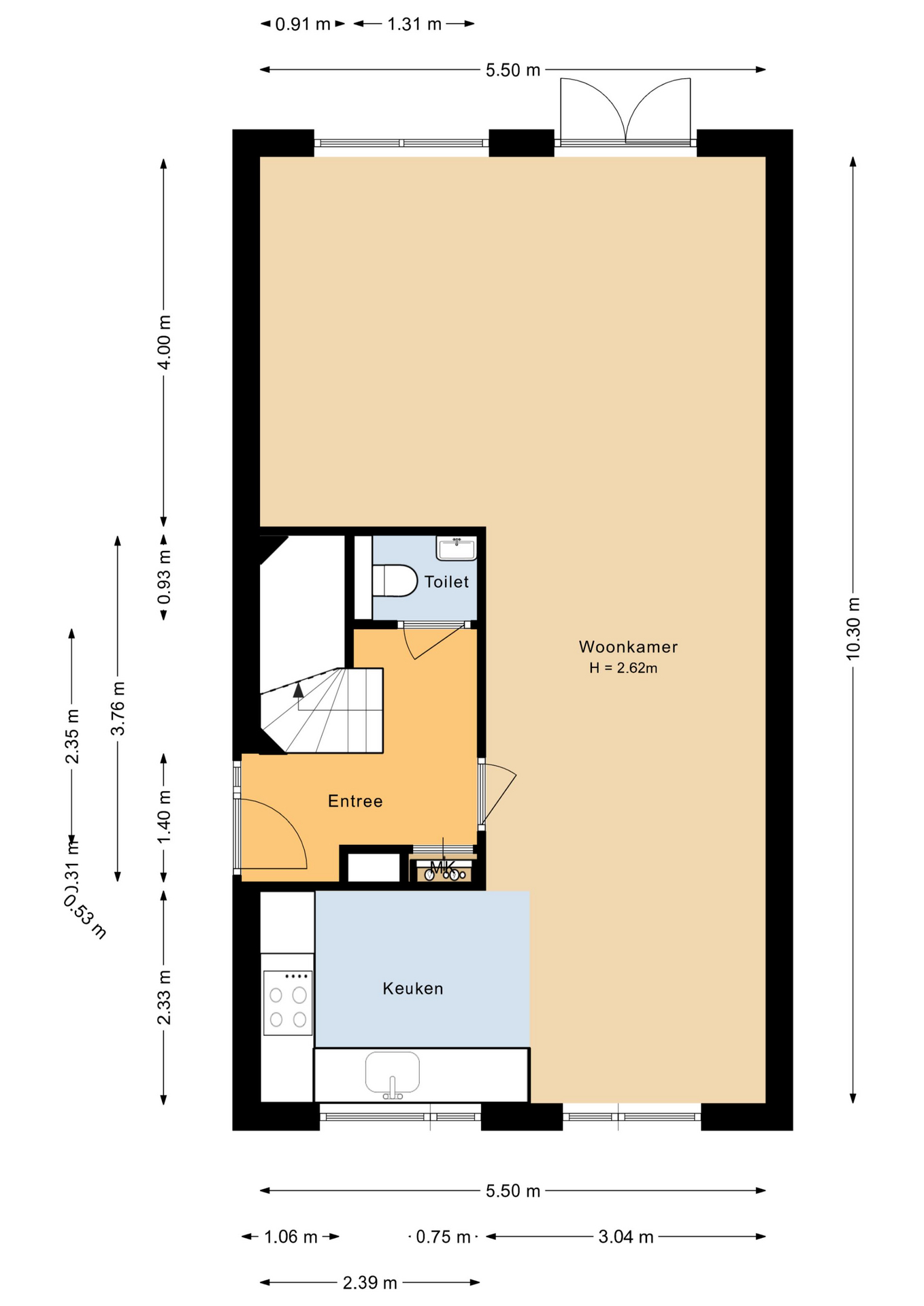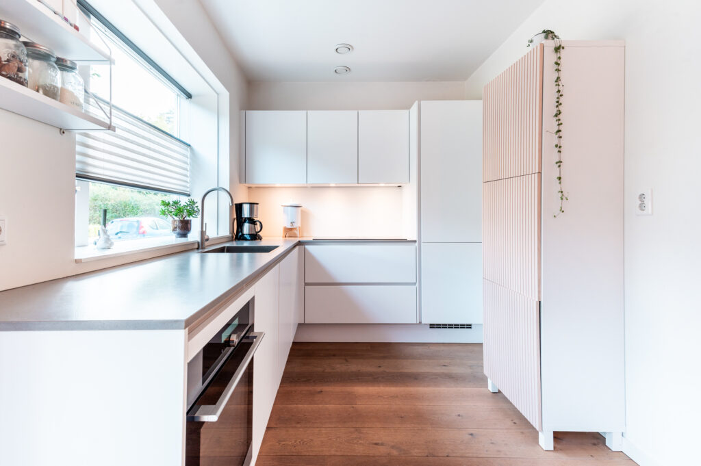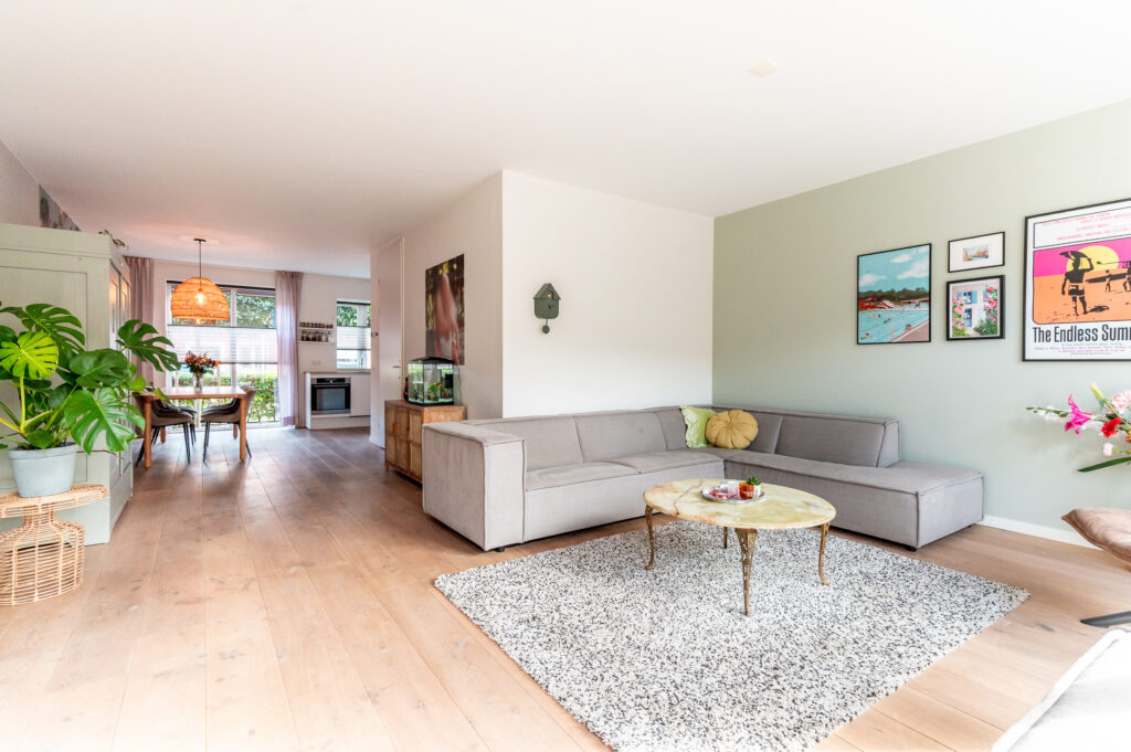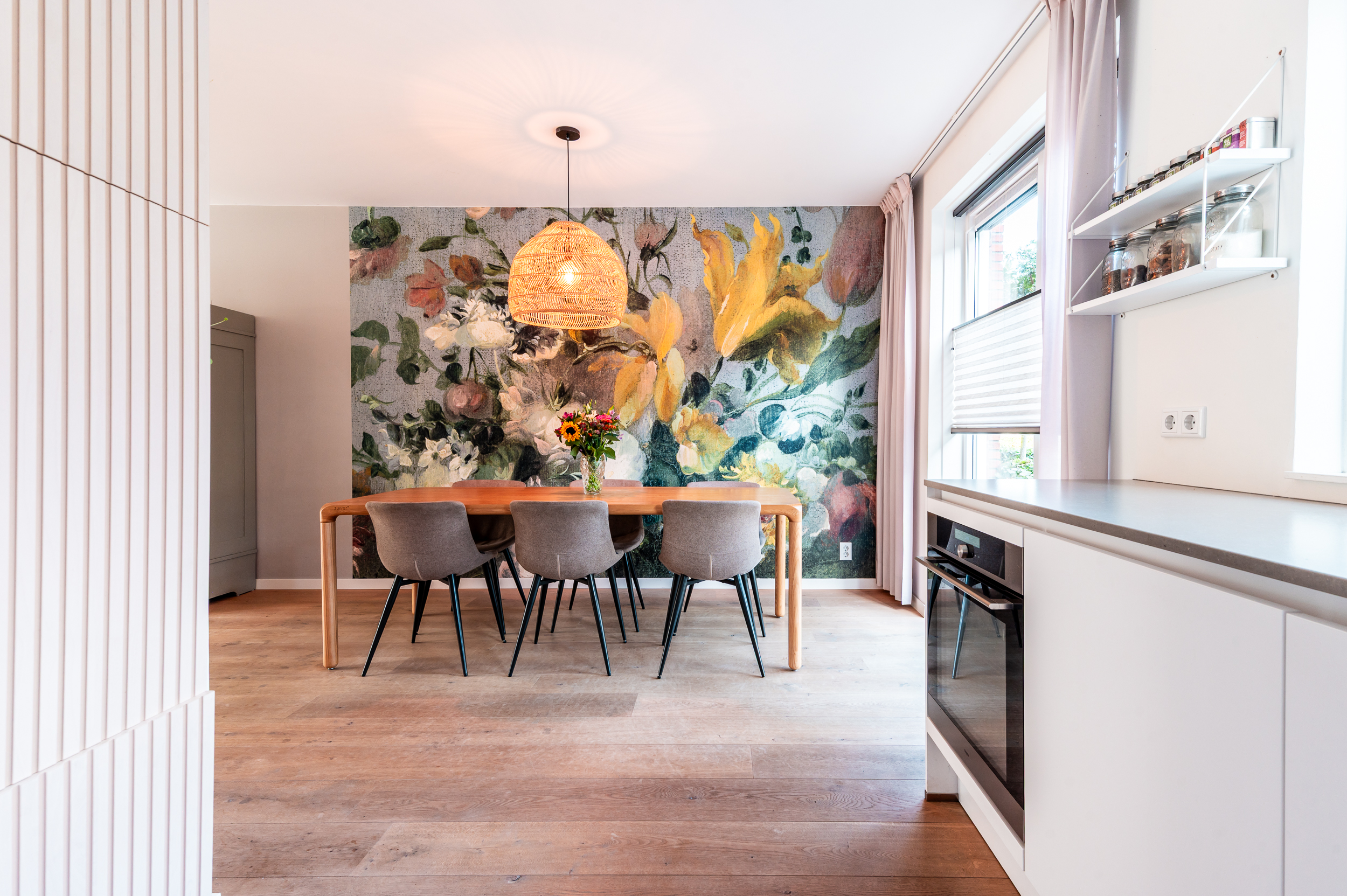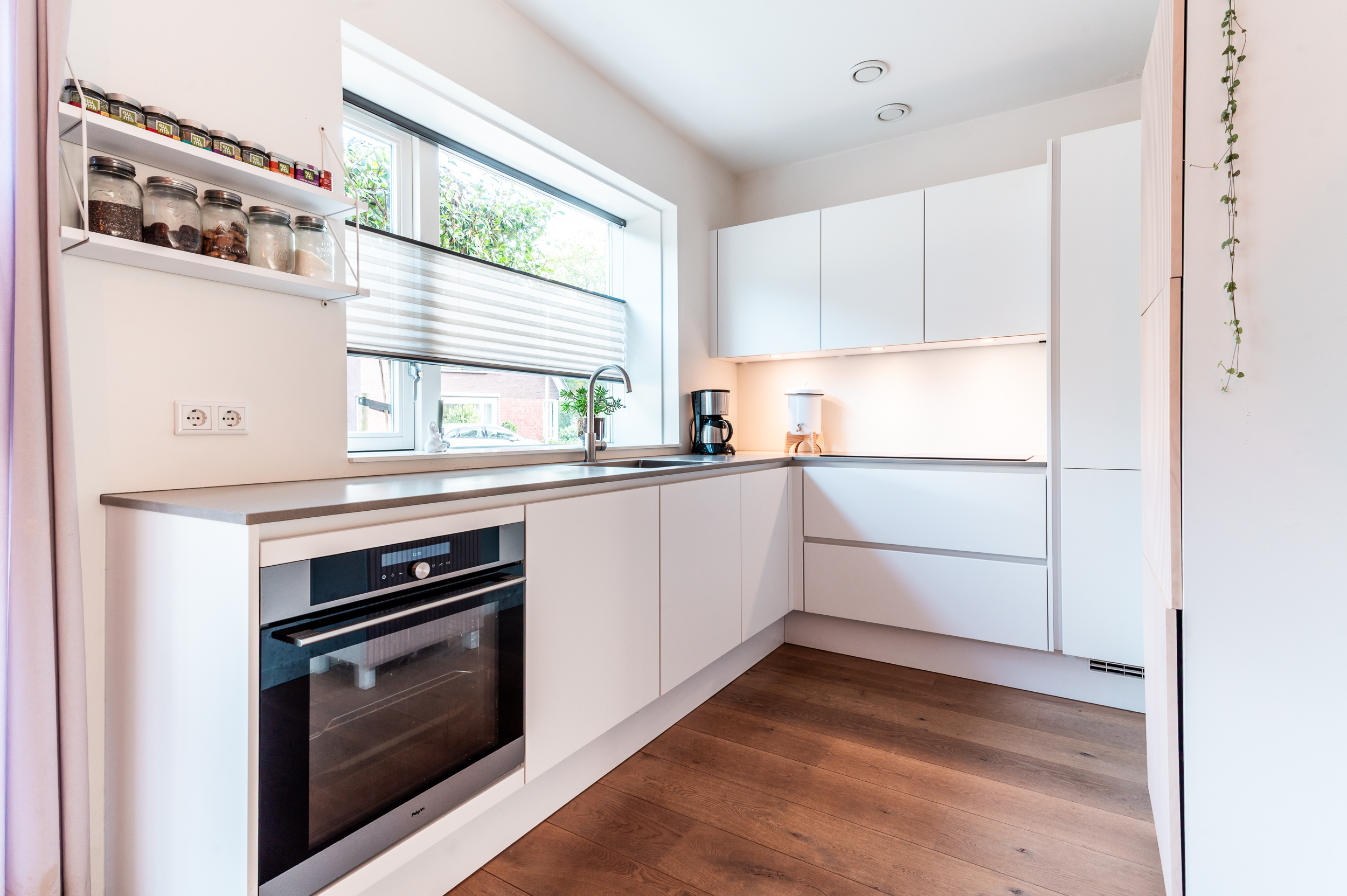 Aan de voorzijde bevindt zich de moderne inbouwkeuken met hoogwaardige apparatuur, waaronder een inductiekookplaat met geïntegreerde afzuiging. Aan de achterzijde ligt de lichte woonkamer, met grote raampartijen en een fraai uitzicht op de achtertuin. De begane grond is voorzien van een houten vloer met vloerverwarming.