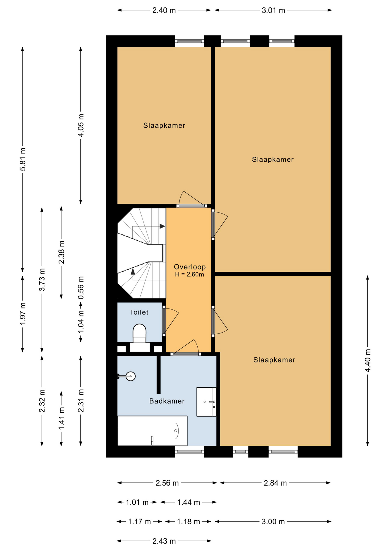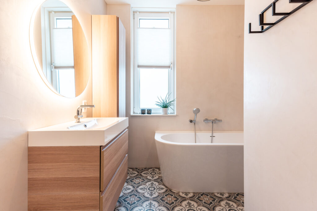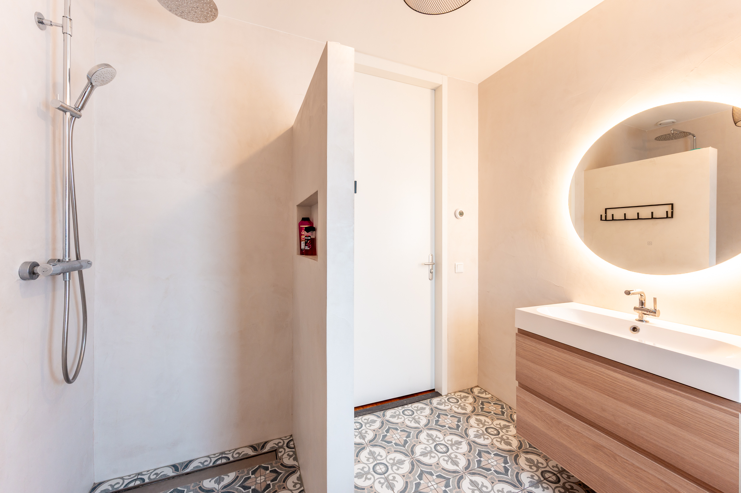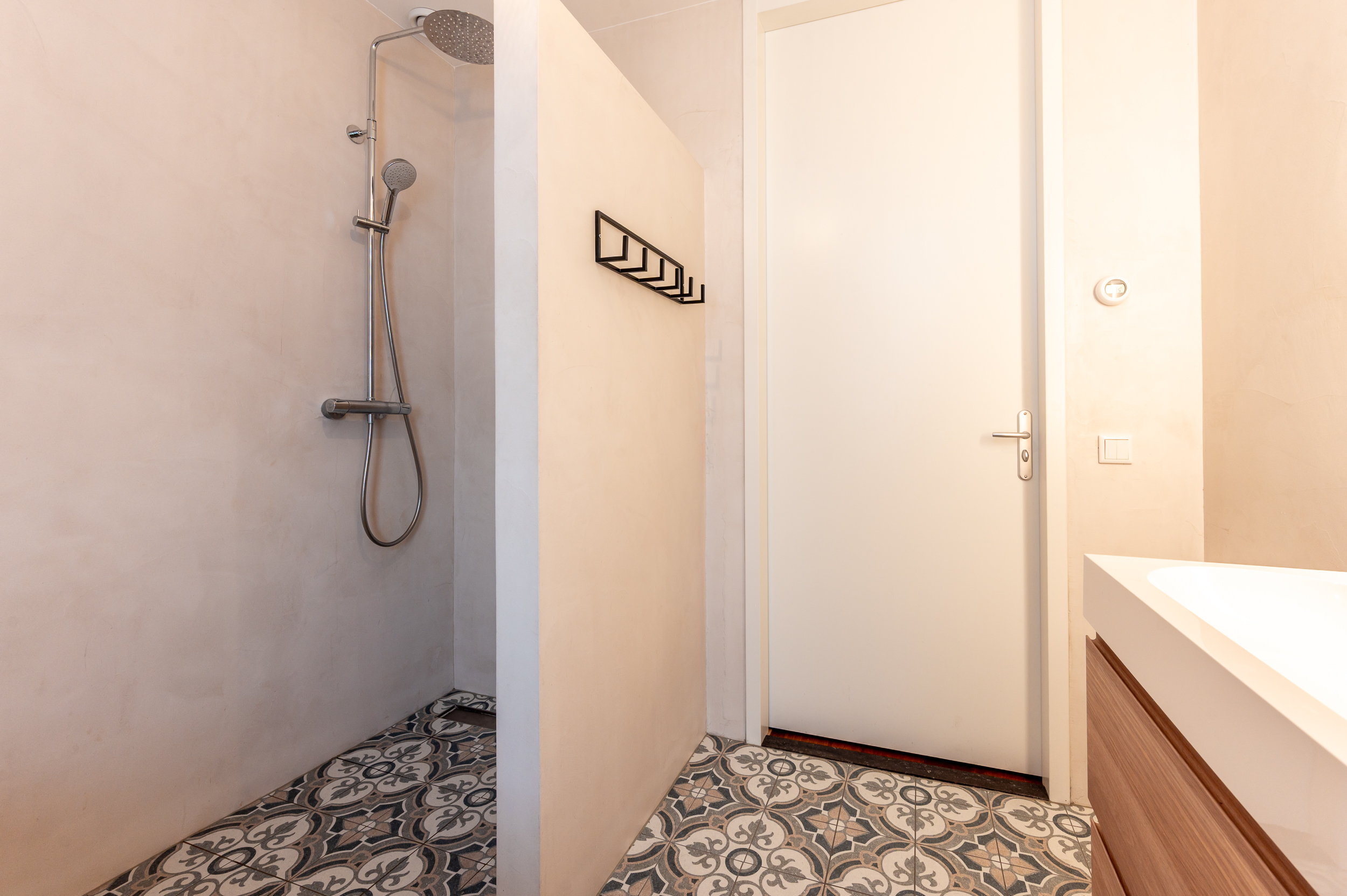 Overloop met toegang tot drie ruime slaapkamers. De moderne badkamer beschikt over een inloopdouche, ligbad en wastafelmeubel. Separaat, zwevend toilet aanwezig.