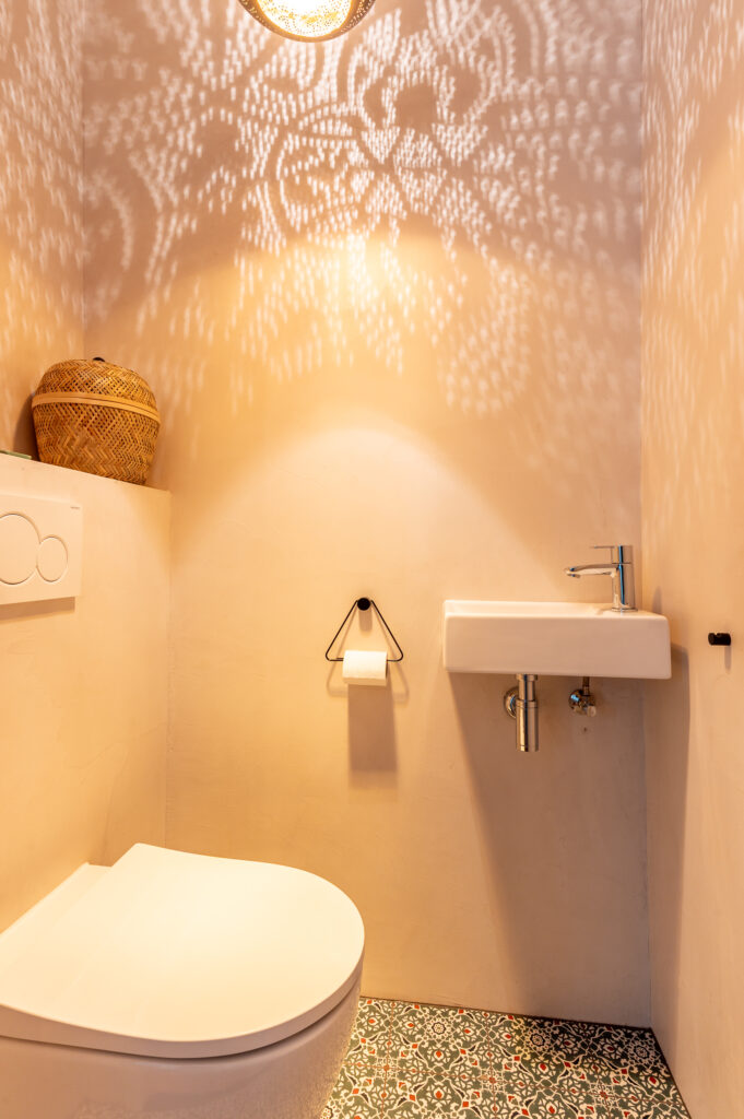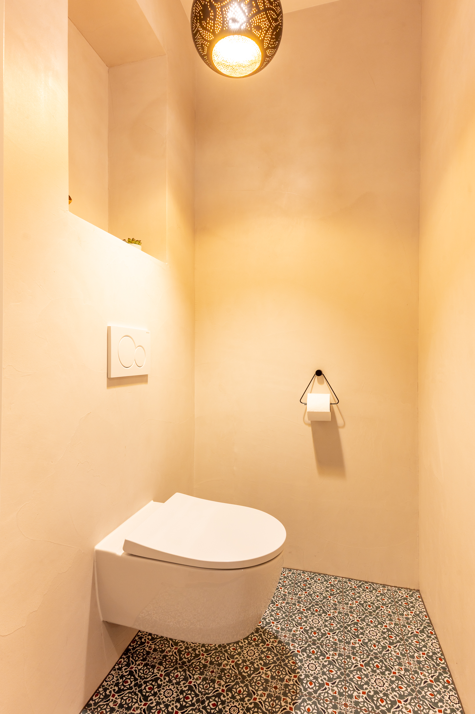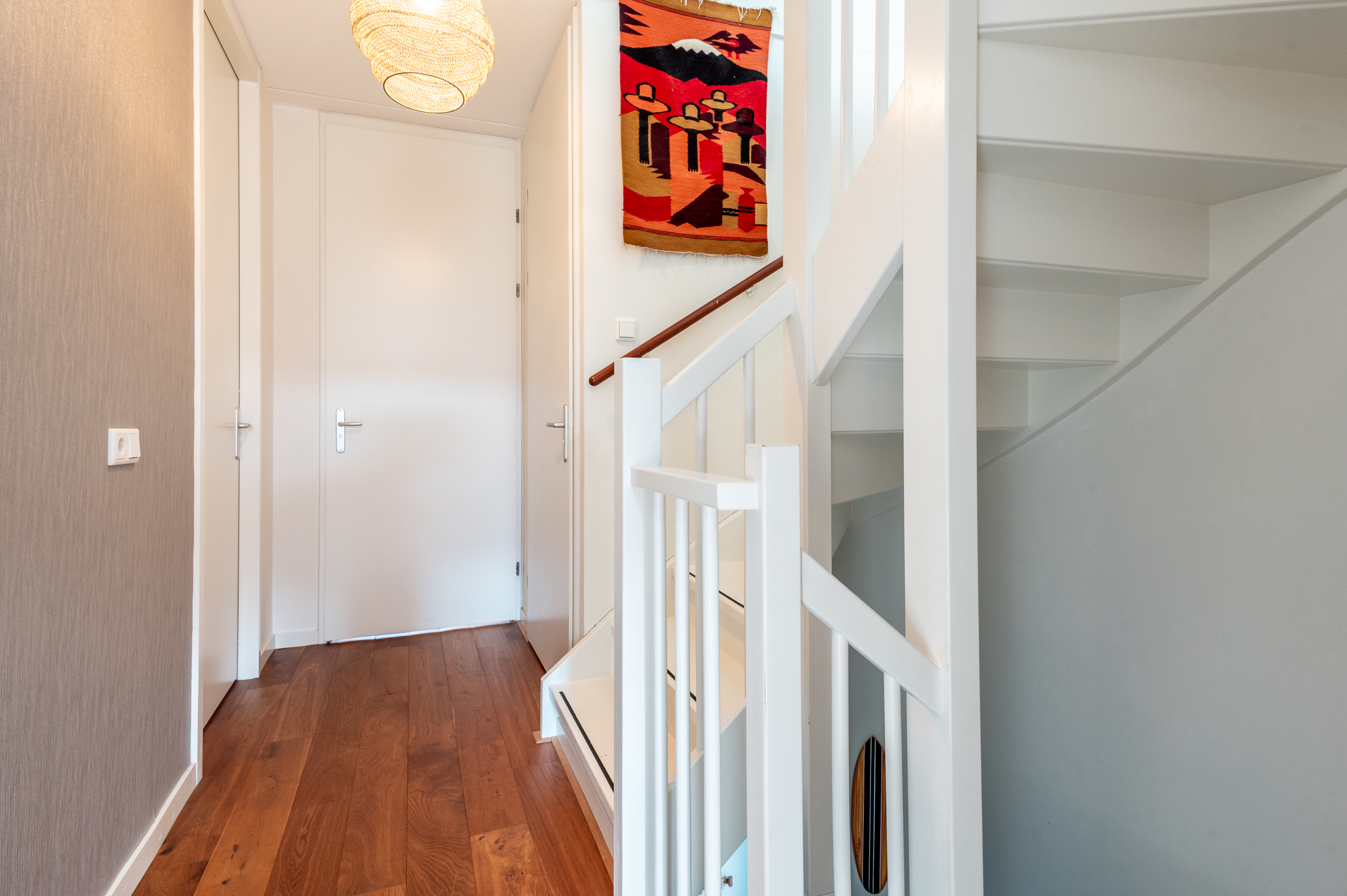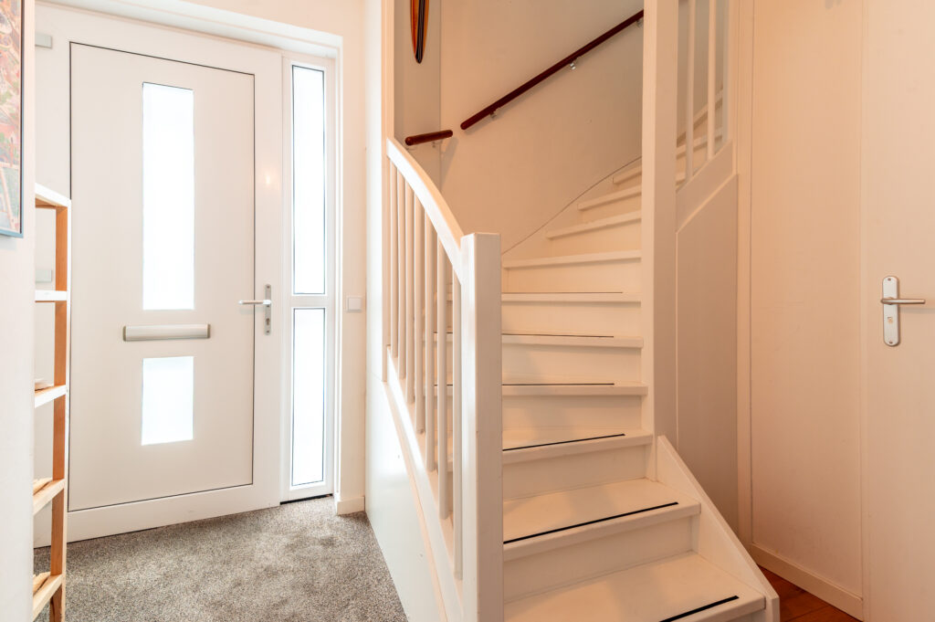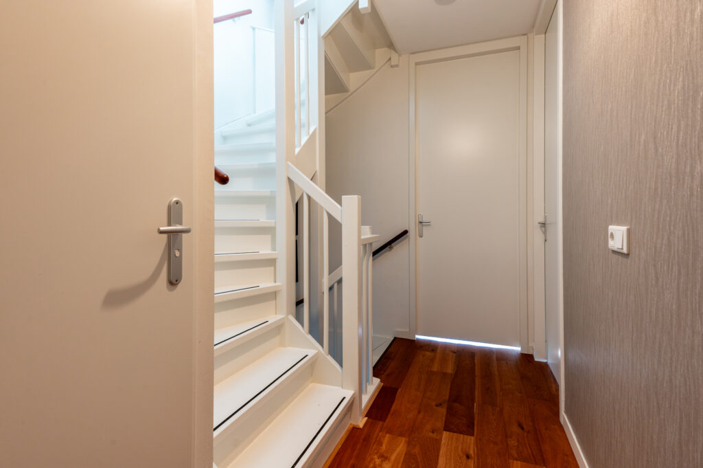 Entree met trapopgang en meterkast. Modern, zwevend toilet met fonteintje.