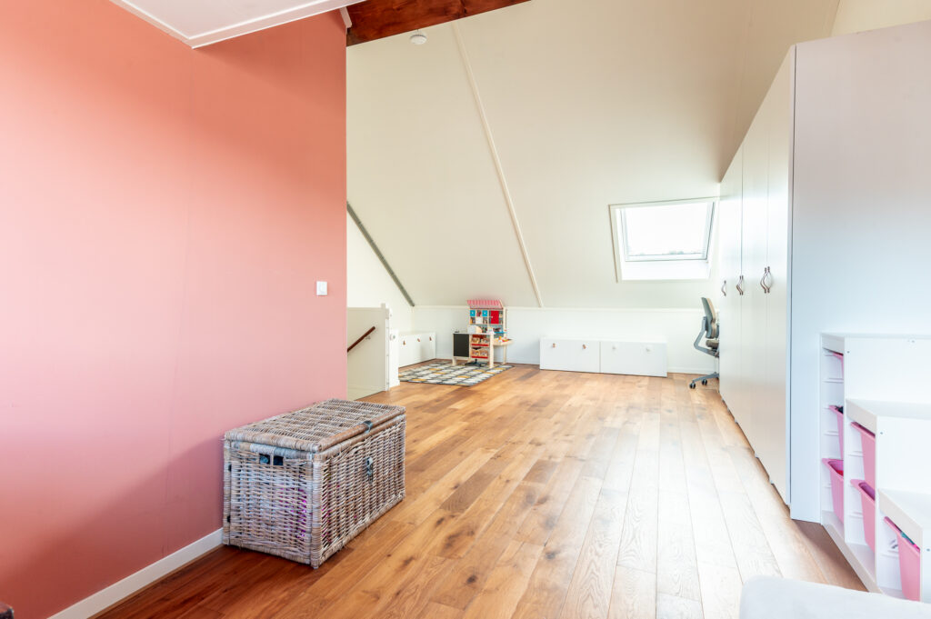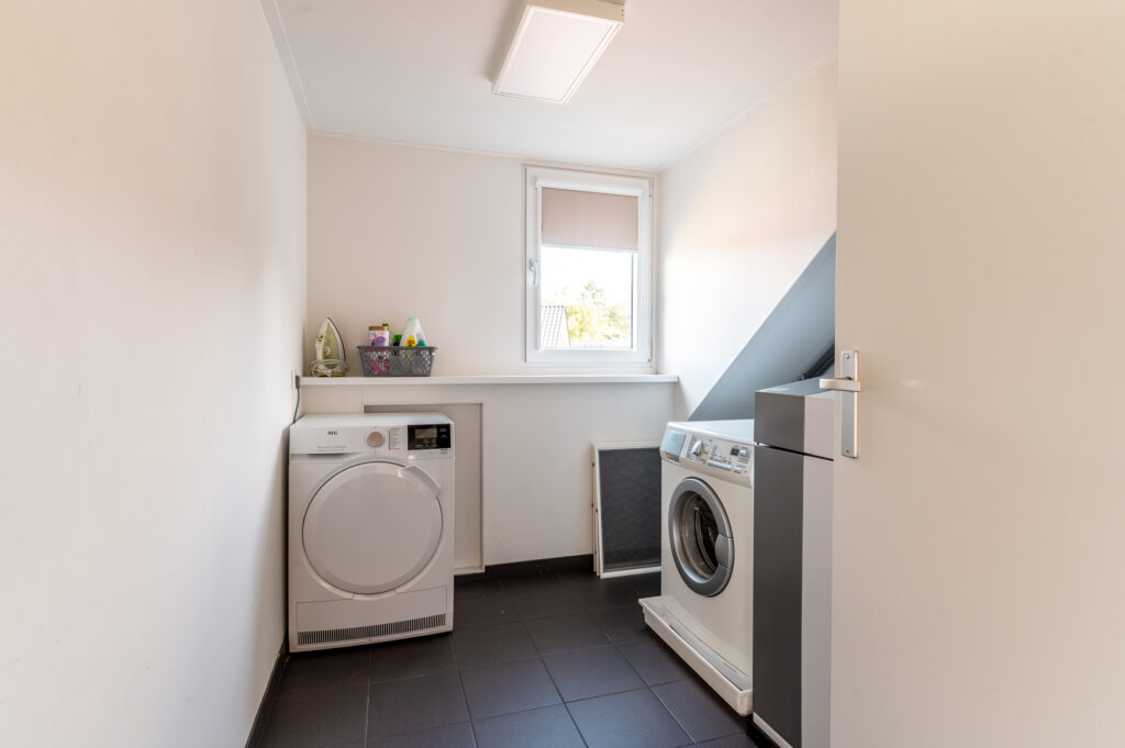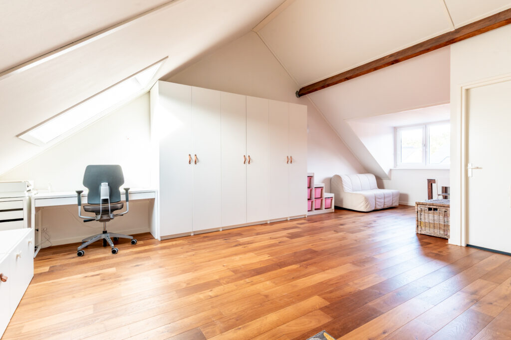 Royale zolderverdieping met veel lichtinval dankzij een dakkapel en een groot Velux-dakraam. Hier bevinden zich de technische ruimte met warmtepomp en de aansluitingen voor wasmachine en droger. Deze verdieping biedt tevens mogelijkheden voor het creëren van een extra slaapkamer of werkruimte.