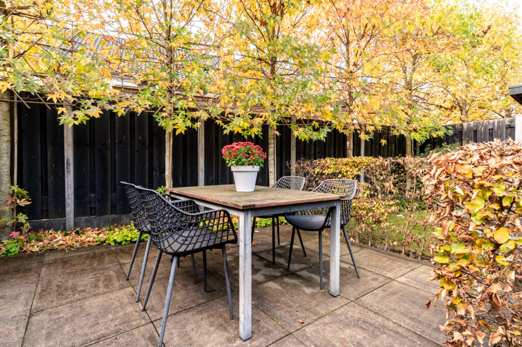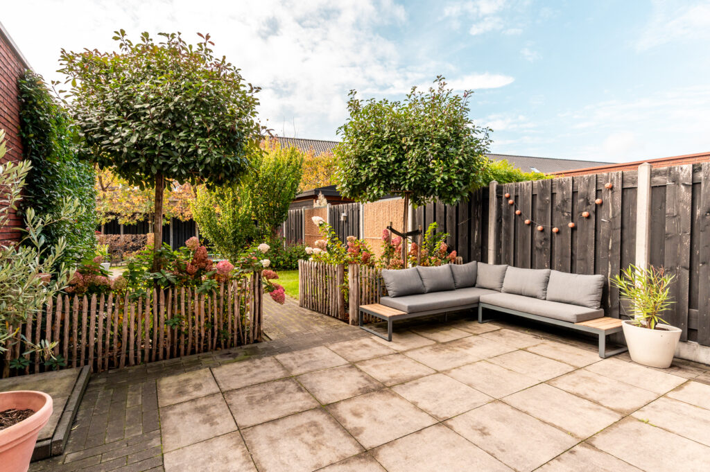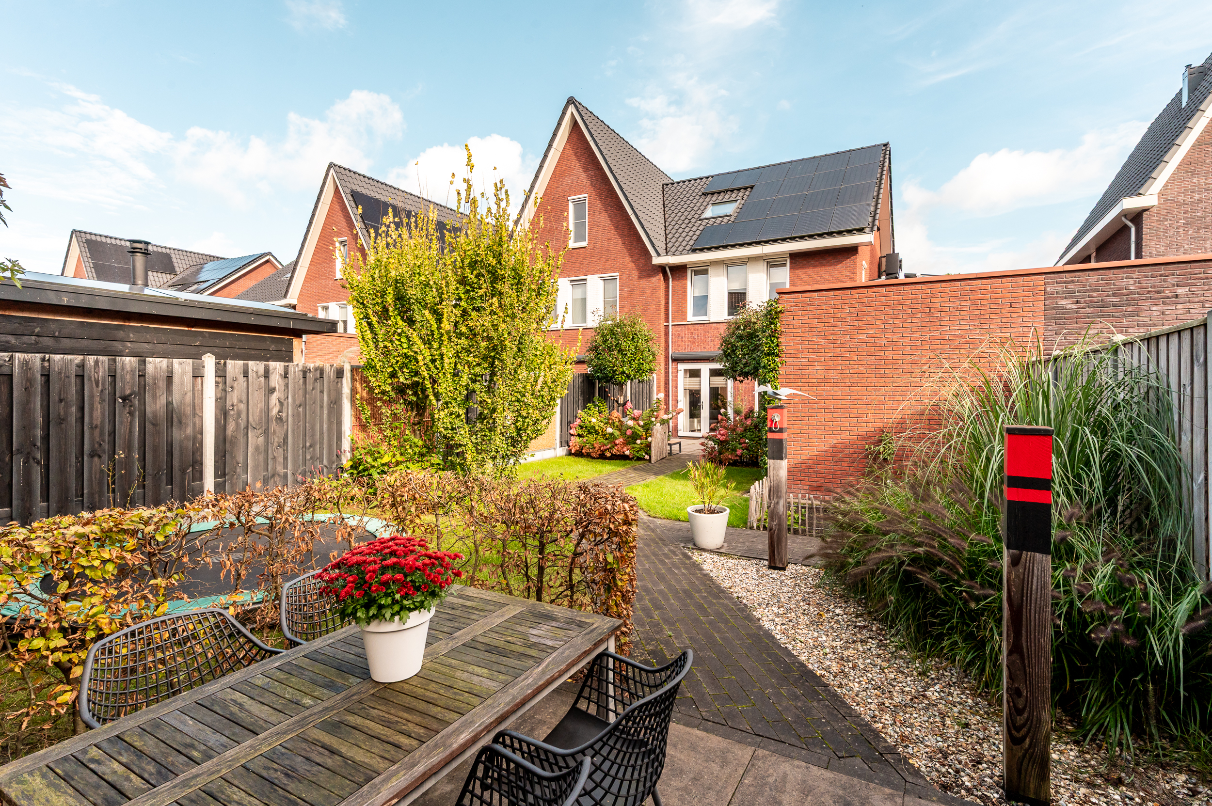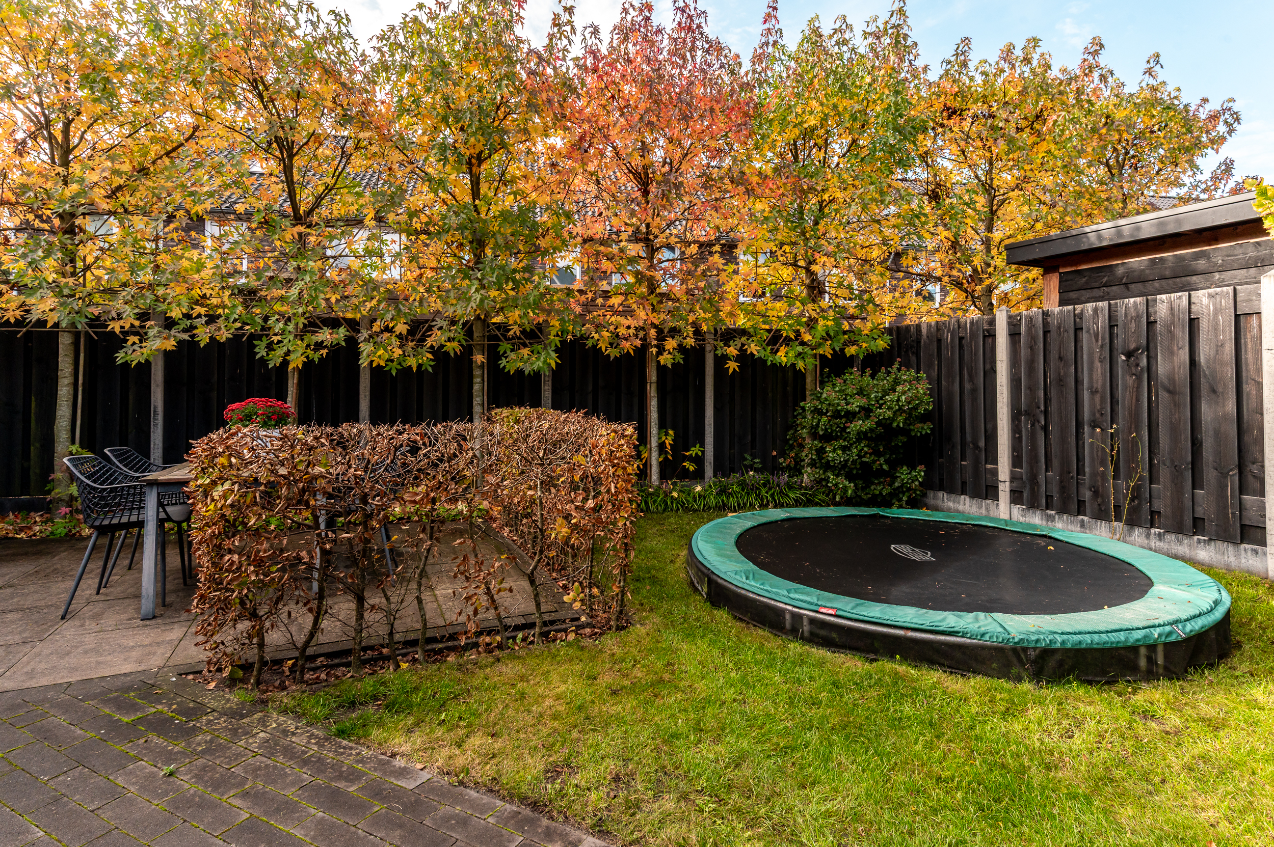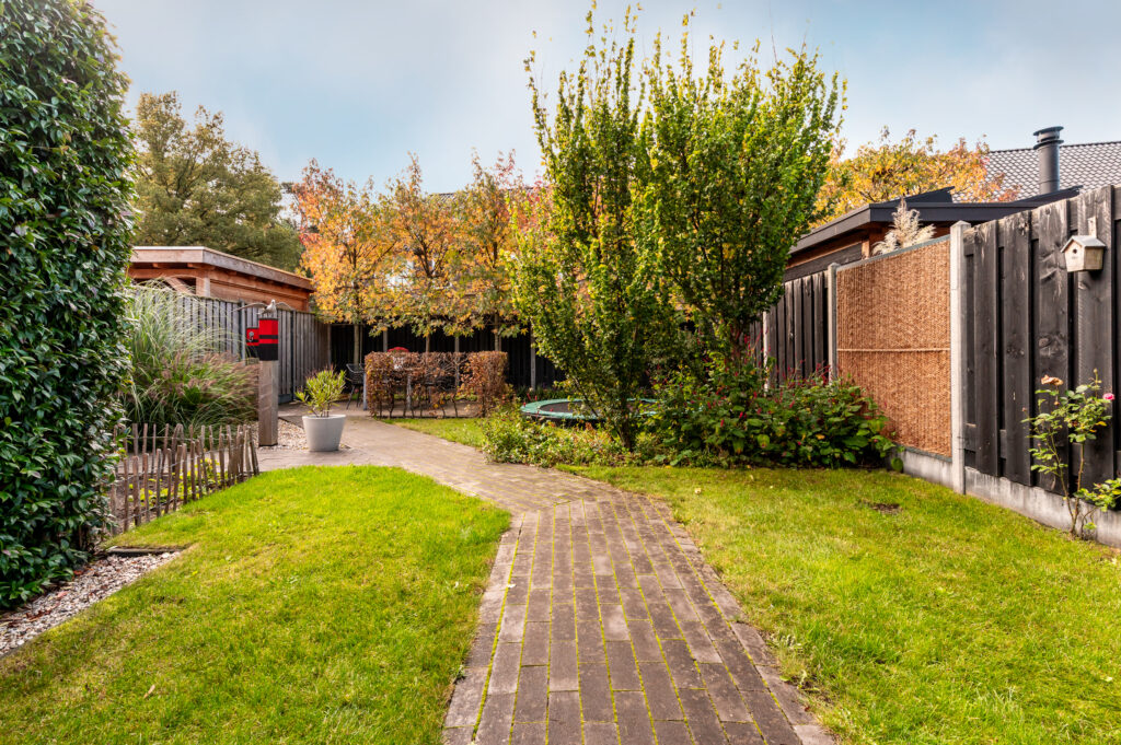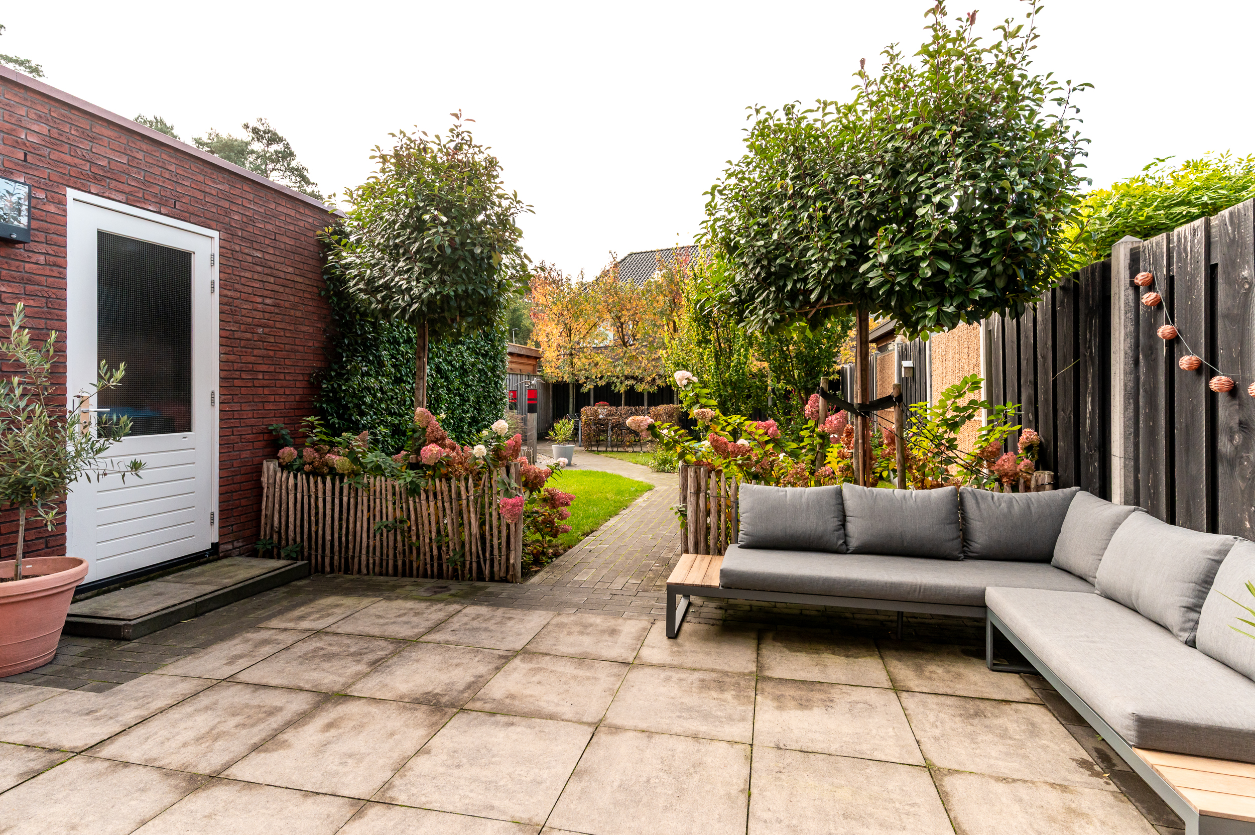 De diepe achtertuin (ca. 18 meter) is fraai aangelegd en verdeeld in meerdere zitgedeelten, zodat u op elk moment van de dag kunt kiezen tussen zon en schaduw. De tuin is gelegen op het zuidwesten en biedt door de aanplant van leibomen veel privacy.