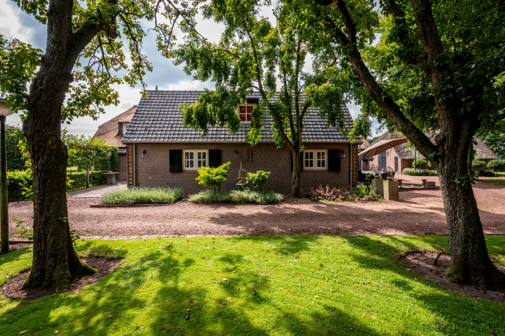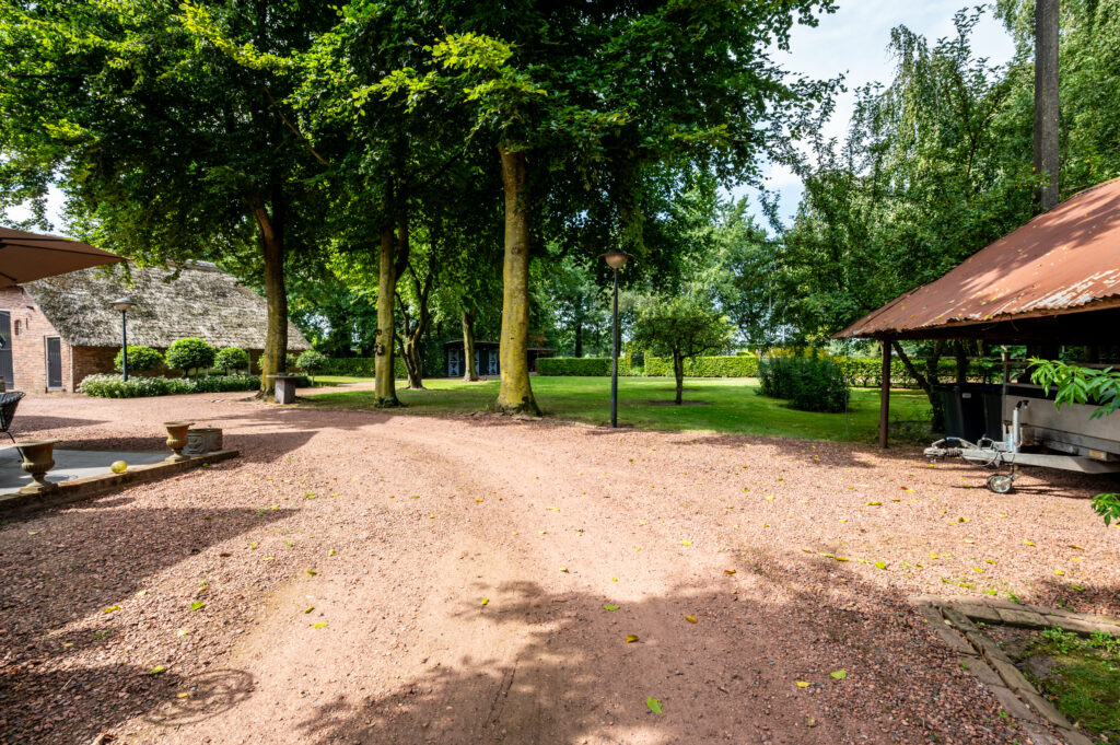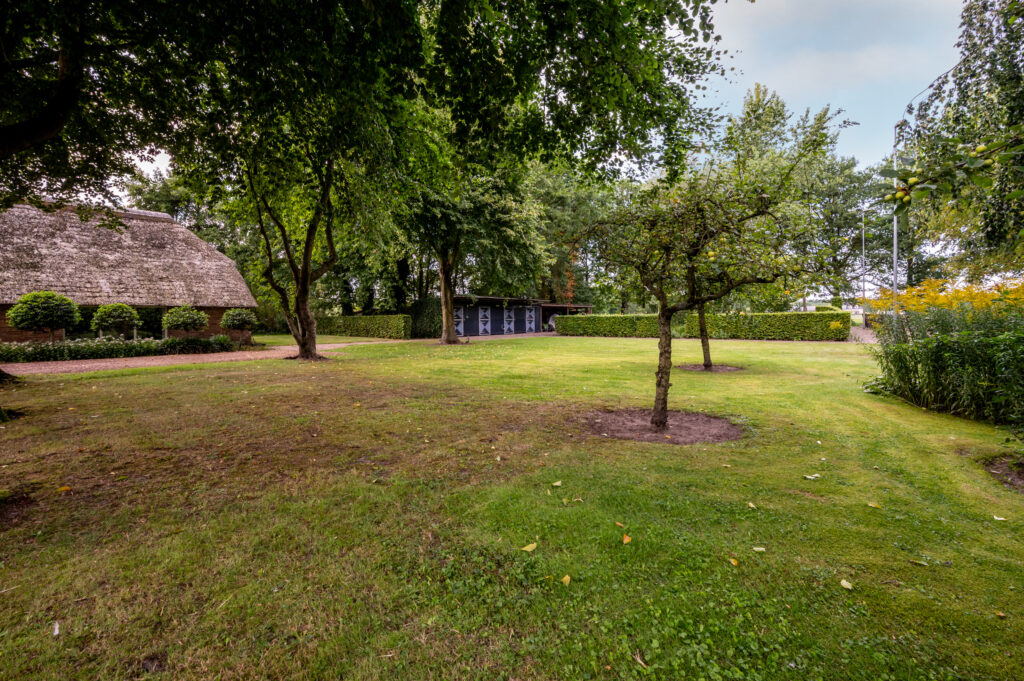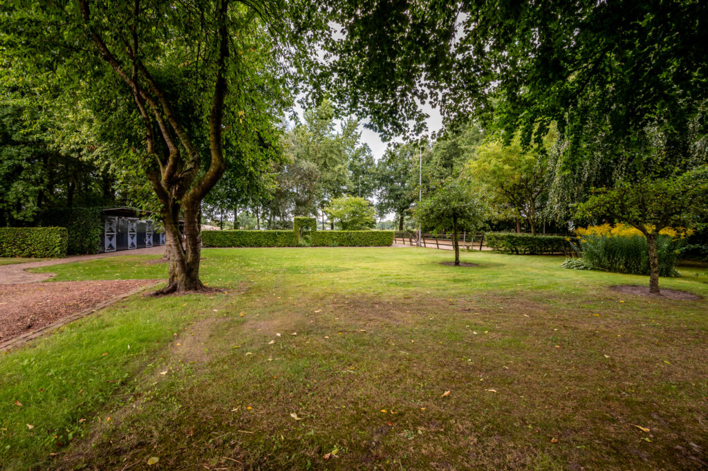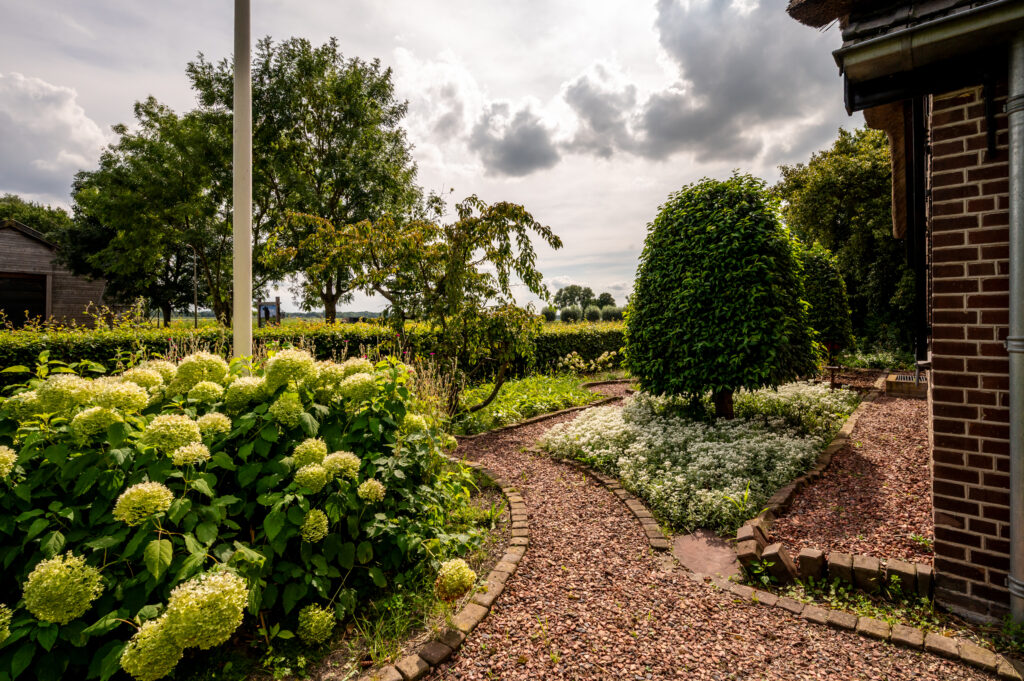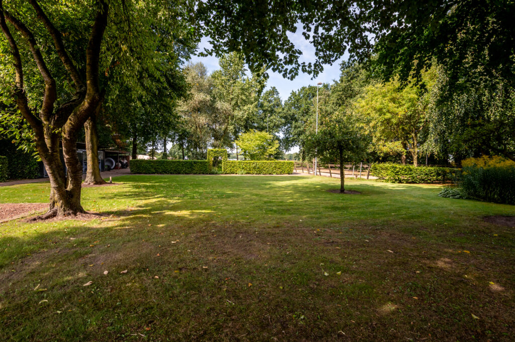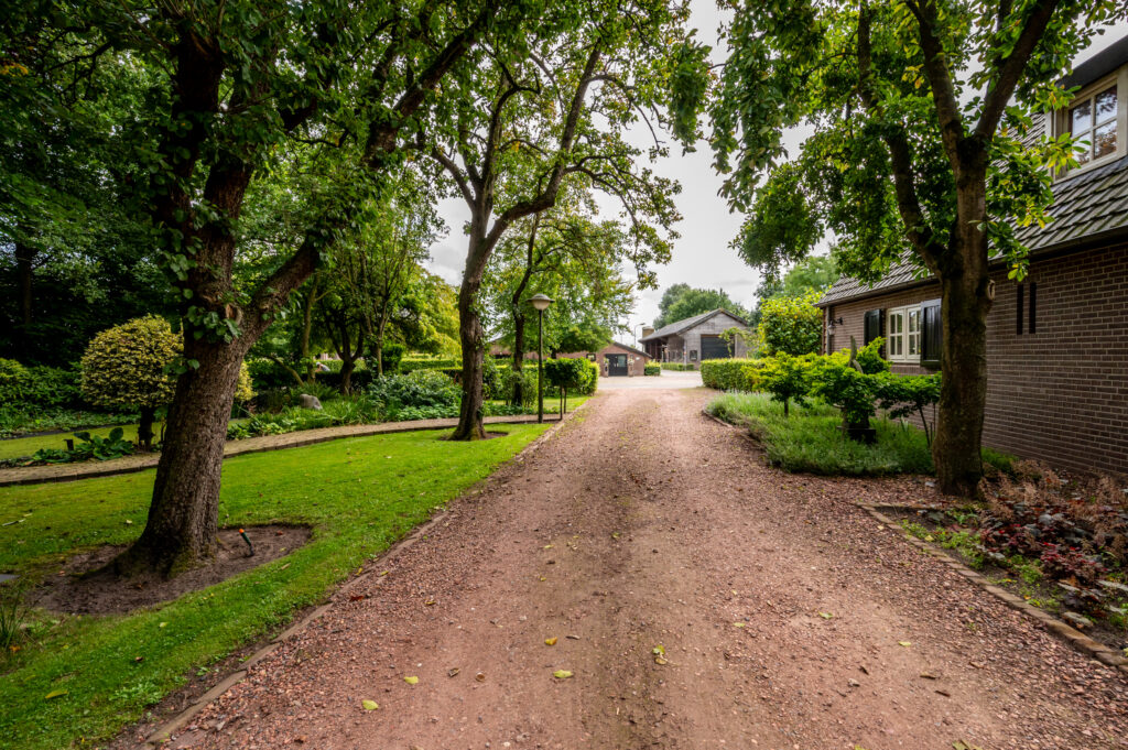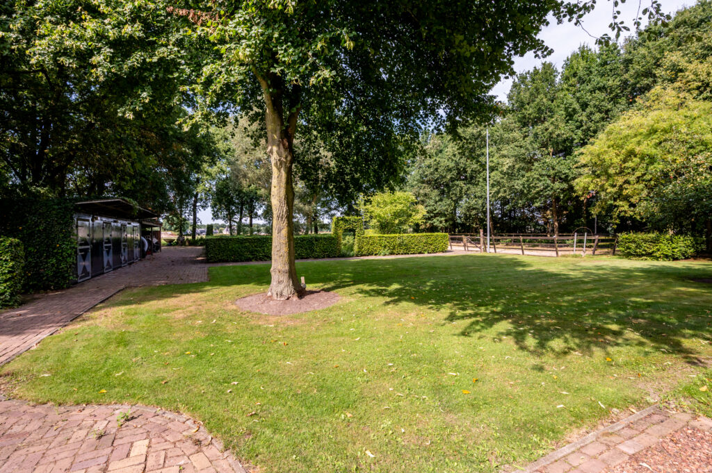 Het perceel is te omschrijven als een sfeervol boerenerf geheel omsloten door bomen. Zodra u via de oprit binnenrijdt langs de aloude perenbomen, ervaart u de rustgevende natuur en volop privacy. De klassieke boerderijtuin met hortensia’s, borders, perken en hagen omlijst de boerderij. Volwassen eiken- en beukenbomen, fruitbomen en een vijver met fontein laten zien hoe het buitenleven is bedoeld! Een enorme gazonpartij met daarachter verschillende tuinkamers worden afgewisseld met passend straatwerk. Kortom, uw eigen perceel geeft volop ruimte en rust. Het aangrenzende weiland is geschikt voor uw paarden of kleinvee aan huis.