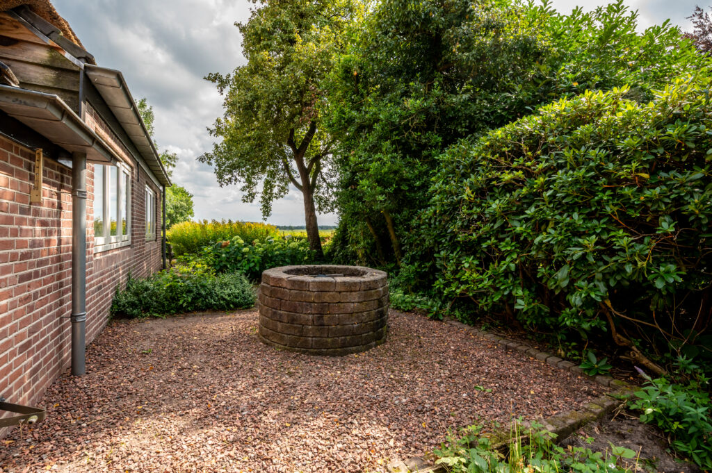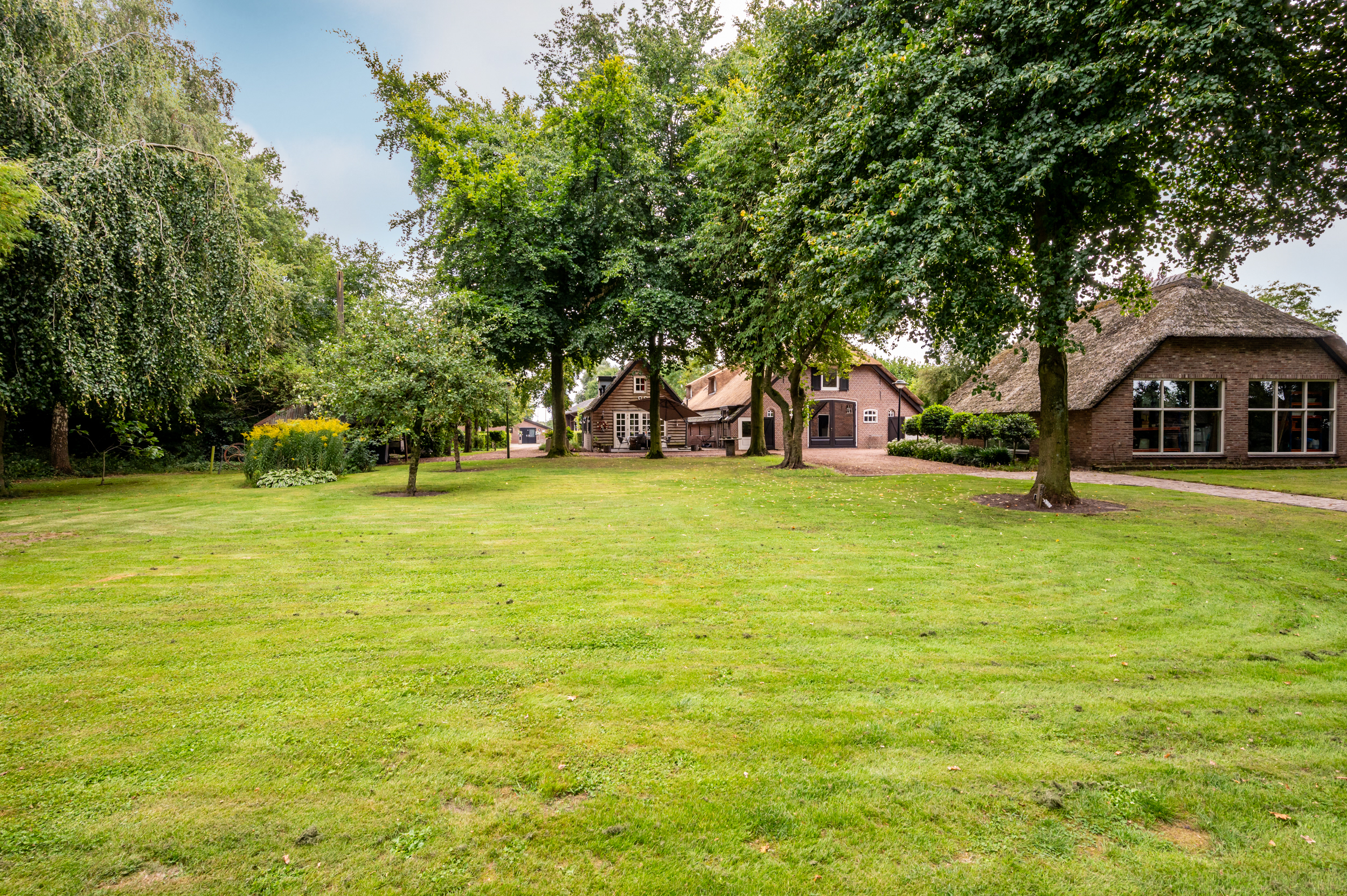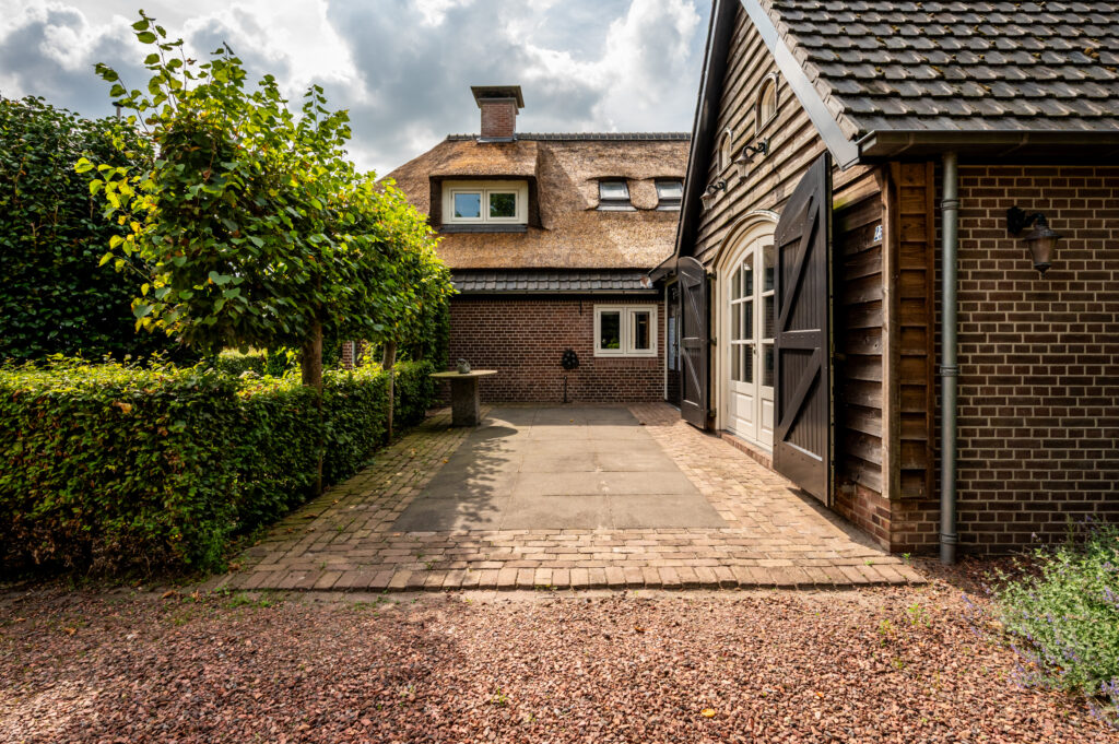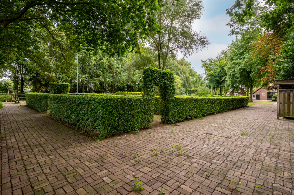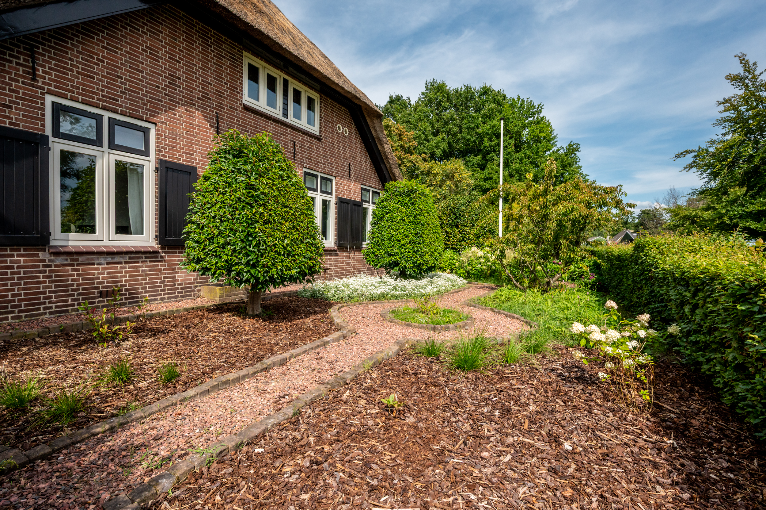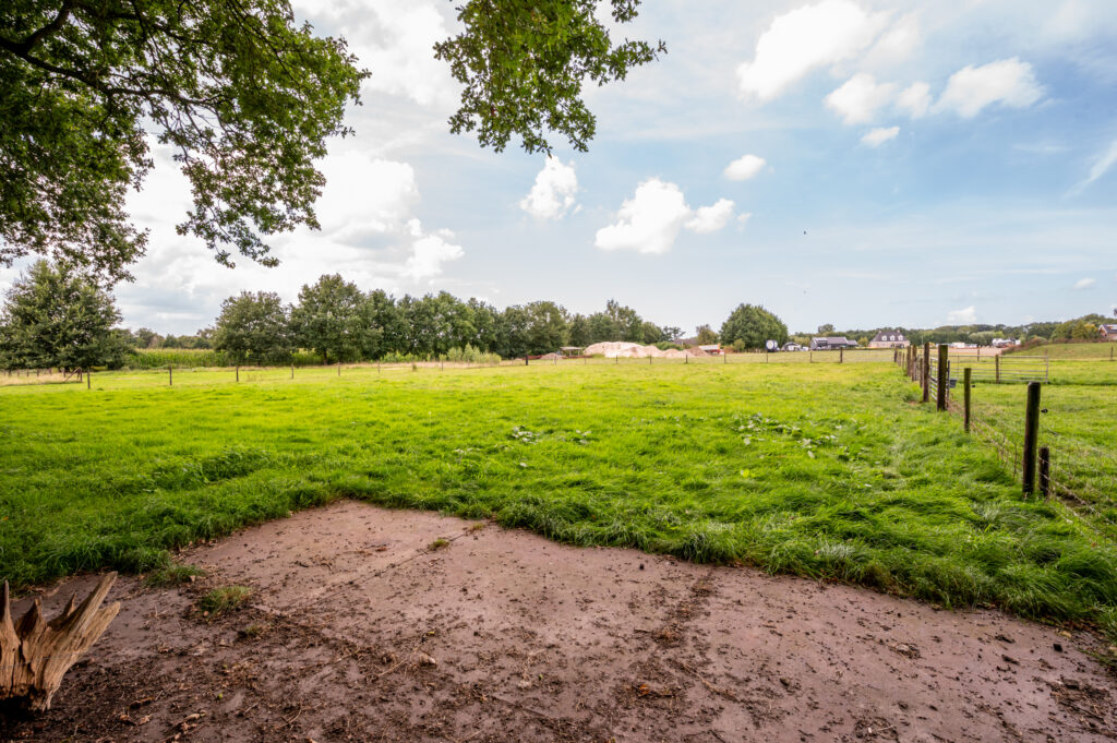 Het perceel is te omschrijven als een sfeervol boerenerf geheel omsloten door bomen. Zodra u via de oprit binnenrijdt langs de aloude perenbomen, ervaart u de rustgevende natuur en volop privacy. De klassieke boerderijtuin met hortensia’s, borders, perken en hagen omlijst de boerderij. Volwassen eiken- en beukenbomen, fruitbomen en een vijver met fontein laten zien hoe het buitenleven is bedoeld! Een enorme gazonpartij met daarachter verschillende tuinkamers worden afgewisseld met passend straatwerk. Kortom, uw eigen perceel geeft volop ruimte en rust. Het aangrenzende weiland is geschikt voor uw paarden of kleinvee aan huis.