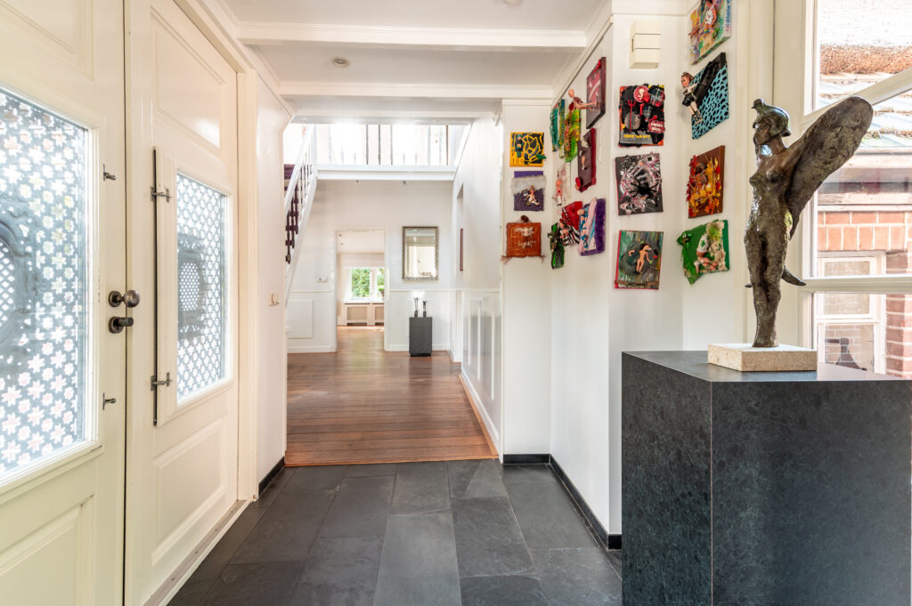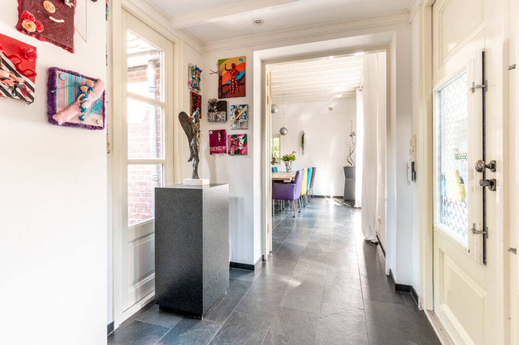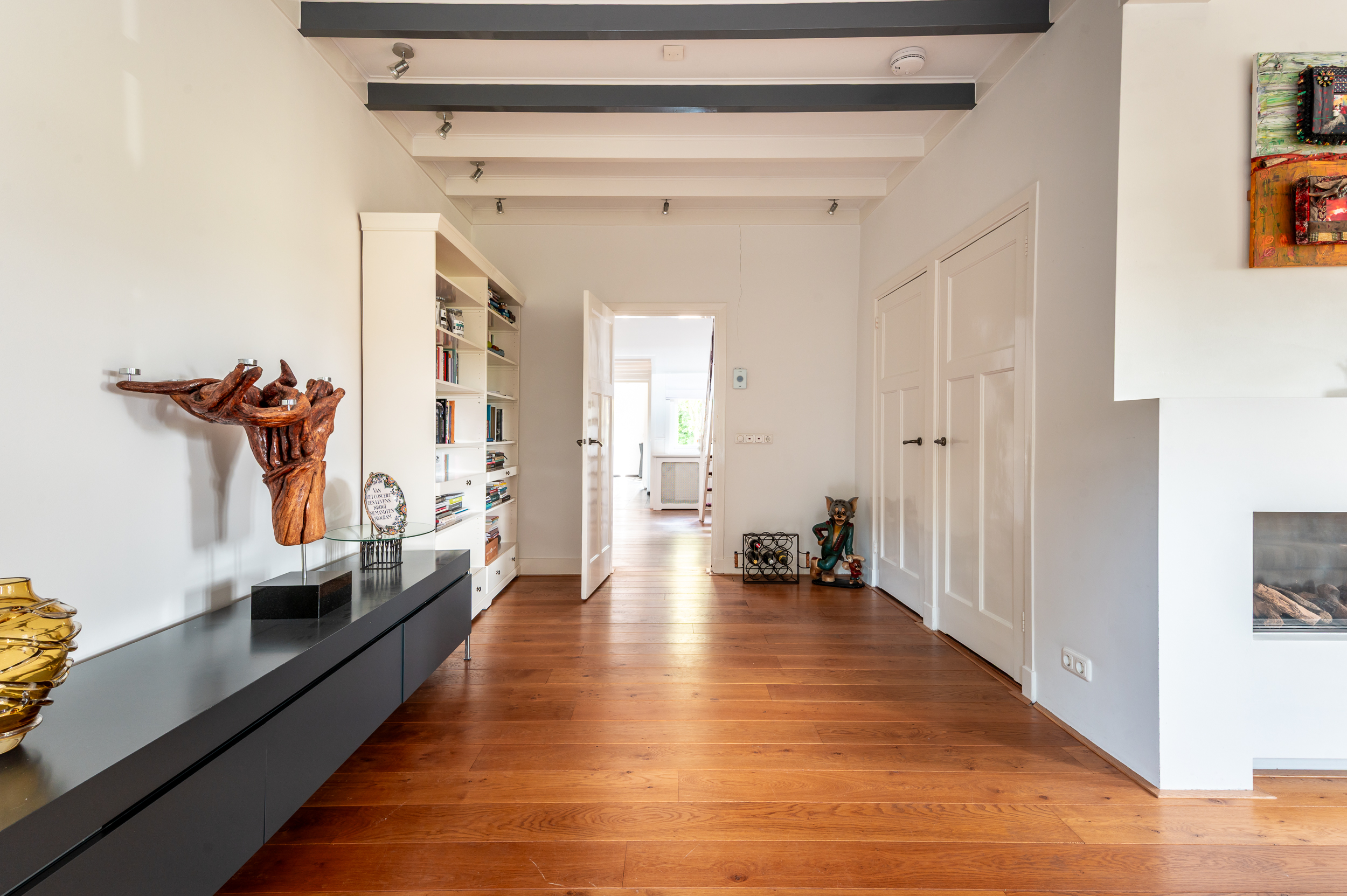 De dubbele voordeur geeft toegang tot de entree met aan de linkerzijde toegang tot de WOONBOERDERIJ en aan de rechterzijde is toegang tot de aanbouw. De landelijke sfeer ervaart u hier direct door de prachtige eiken vloerdelen, de lambrisering en een royale trap met vide. Via de hal komt u als eerste in de keuken voorzien van een betonnen aanrechtblad, een vaatwasser en close in boiler. De schouw met authentieke tegeltjes en gashaard past in het geheel waarbij het balkenplafond en de paneeldeuren de landelijk sfeer onderstrepen. De voormalige voordeur met levensboom geeft toegang tot de voortuin. Naast deze deur is de meterkast. De woon-leefruimte loopt in een U-vorm en bij de moderne schouw met gaskachel is een gezellige zithoek gecreëerd. Vervolgens is er een ingebouwde kast en kast met toegang tot de kelder en komt u weer in de ruime hal van dit familiehuis. In de nis is de garderobe, het toilet en de badkamer met bad, wastafel, douche en aansluiting voor wasmachine en droger. Ook is hier de doorgang naar de master bedroom met walk in closet. Via de doorgang komt u vervolgens op de deel met nieuwe gebinten, radiatoren, meterkast en zijn de voormalige staldeuren vervangen door royale raampartijen. Eveneens is hier een toegangsdeur naar buiten. Deze open ruimte biedt tal van mogelijkheden zoals het creëren van een indrukwekkende woonkeuken, meerdere (slaap-) kamers, speelkamer voor de kinderen of uw praktijk/salon/atelier aan huis.