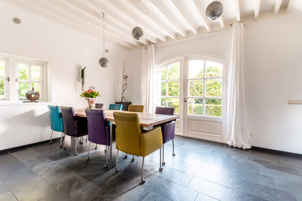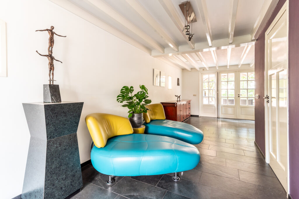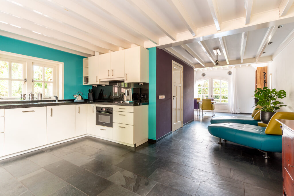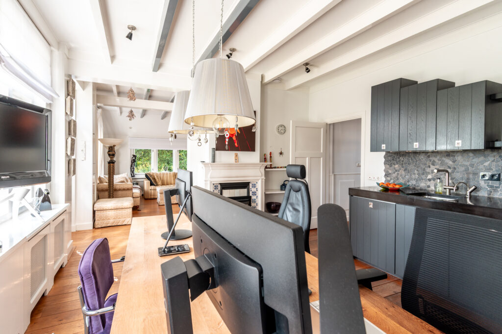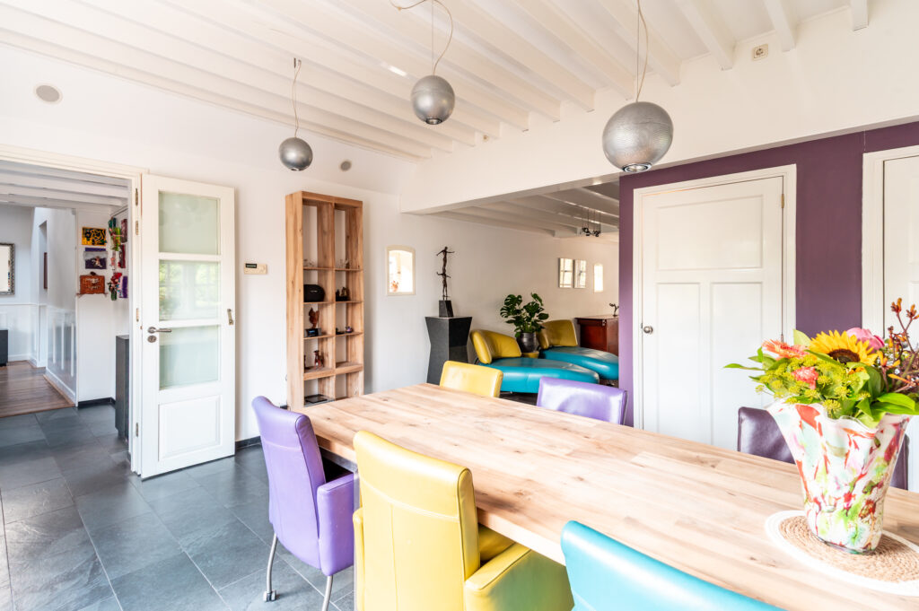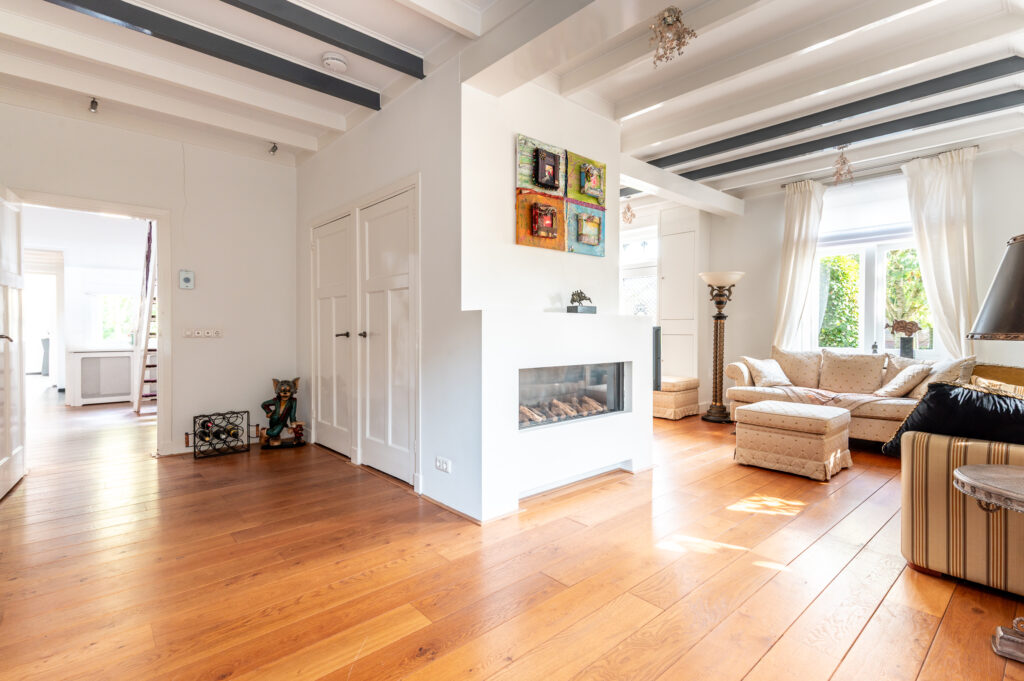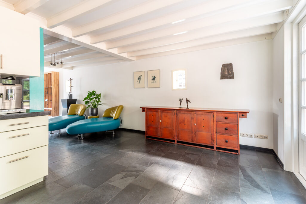 Vanaf de voordeur is aan de rechterzijde de aanbouw toegankelijk voorzien van vloerverwarming. Via de schuifdeur komt u in de woon-leefruimte met aan de voorzijde het zitgedeelte en aan de achterzijde de keukenopstelling met een natuurstenen aanrechtblad, 5 zones inductieplaat, combi oven-magnetron, vaatwasser en koel-vriescombinatie. Ook hier is een houten balkenplafond en de originele ramen zijn voorzien van voorzetglas. Openslaande deuren geven toegang tot het terras. De badkamer heeft vloerverwarming, een stoomcabine met douche, toilet en wastafel.