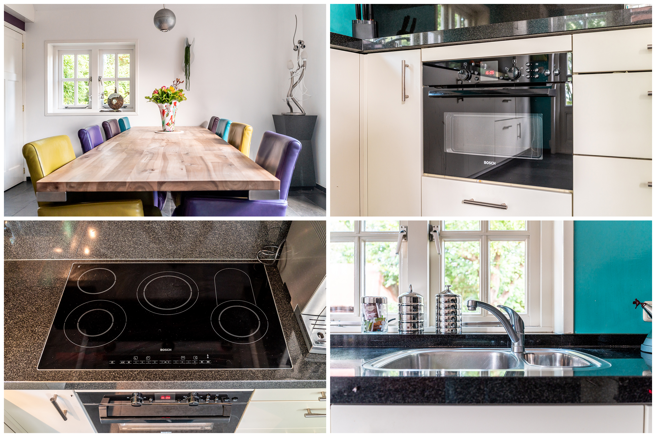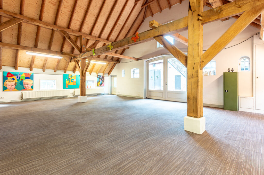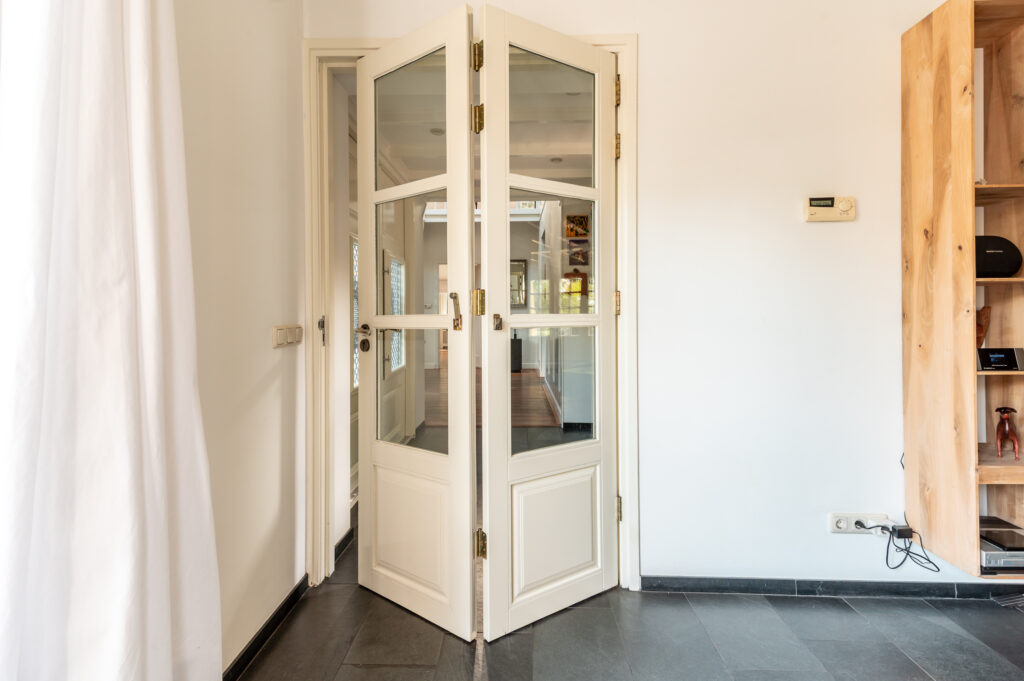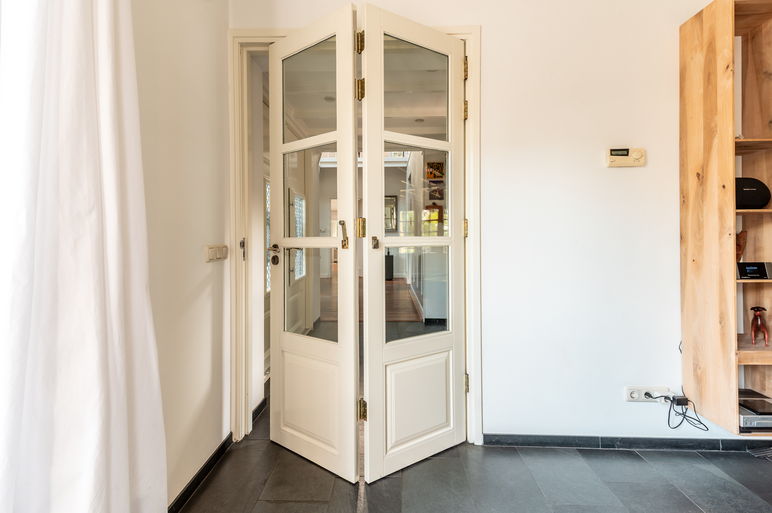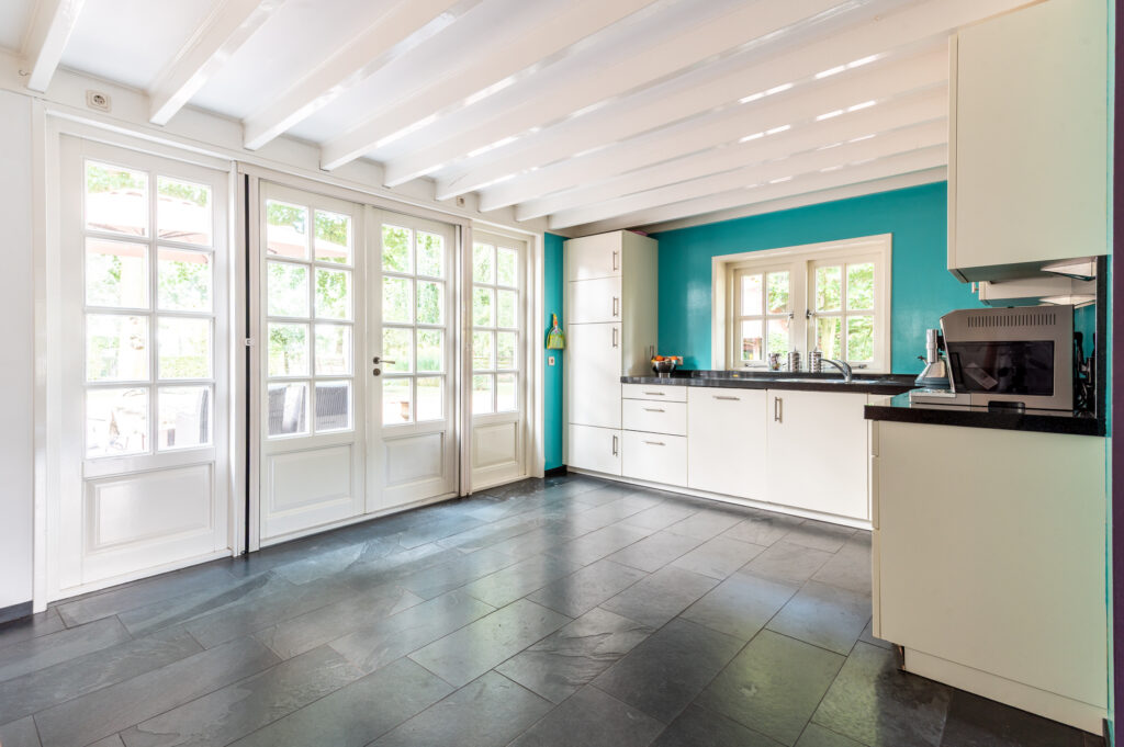 Vanaf de voordeur is aan de rechterzijde de aanbouw toegankelijk voorzien van vloerverwarming. Via de schuifdeur komt u in de woon-leefruimte met aan de voorzijde het zitgedeelte en aan de achterzijde de keukenopstelling met een natuurstenen aanrechtblad, 5 zones inductieplaat, combi oven-magnetron, vaatwasser en koel-vriescombinatie. Ook hier is een houten balkenplafond en de originele ramen zijn voorzien van voorzetglas. Openslaande deuren geven toegang tot het terras. De badkamer heeft vloerverwarming, een stoomcabine met douche, toilet en wastafel.