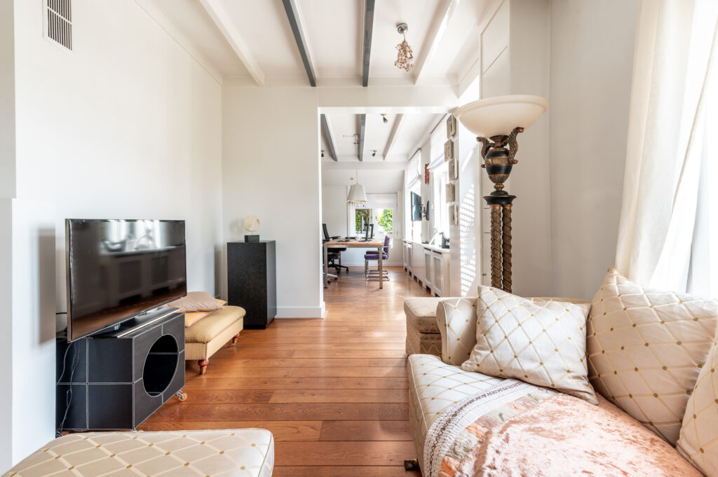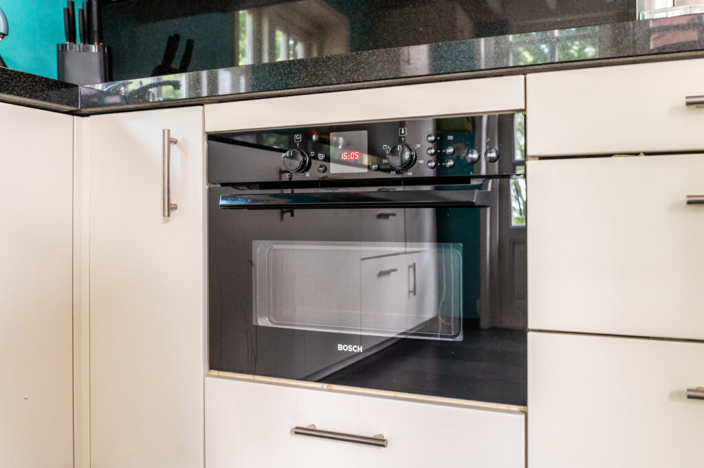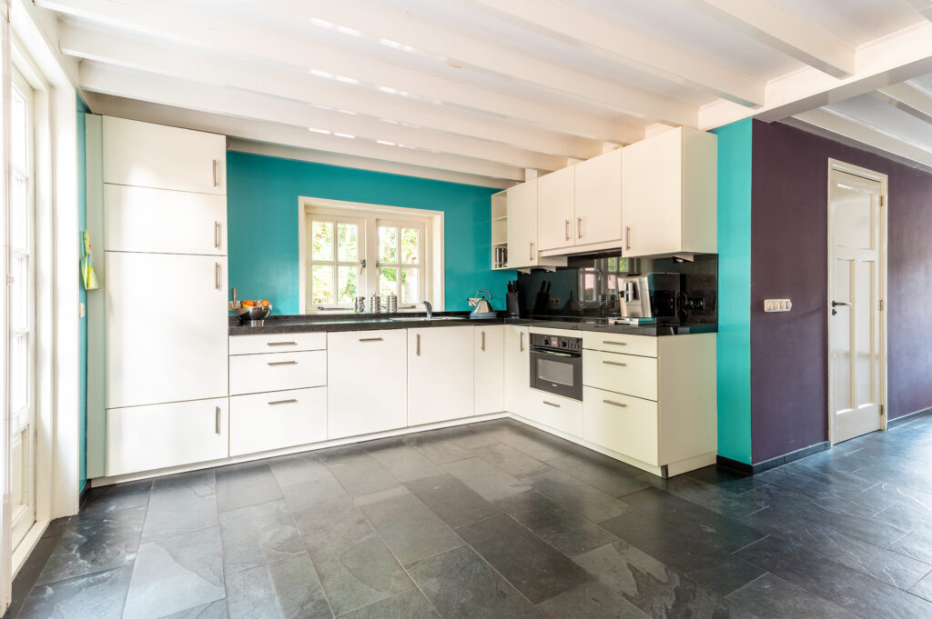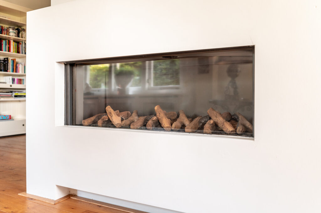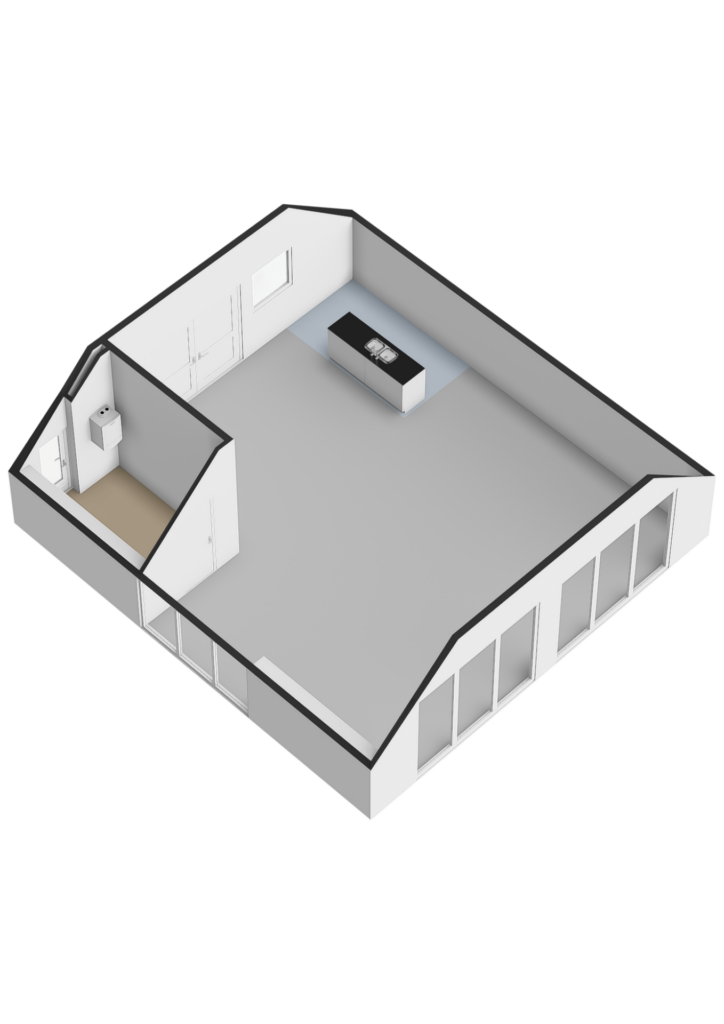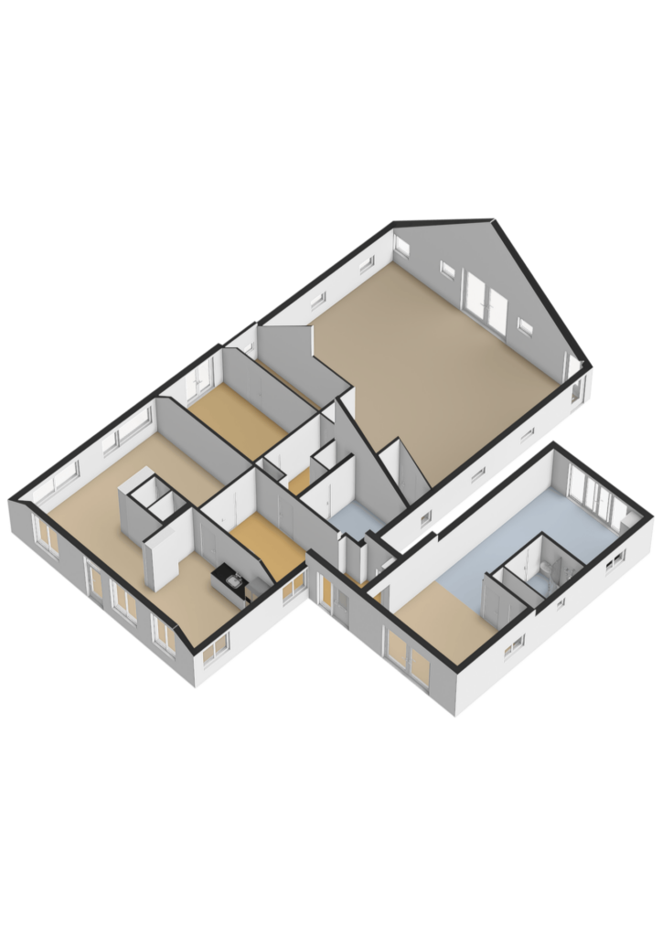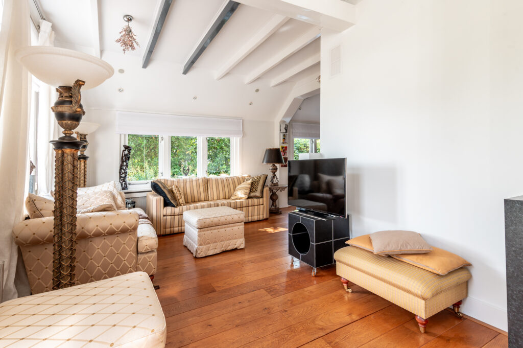 Vanaf de voordeur is aan de rechterzijde de aanbouw toegankelijk voorzien van vloerverwarming. Via de schuifdeur komt u in de woon-leefruimte met aan de voorzijde het zitgedeelte en aan de achterzijde de keukenopstelling met een natuurstenen aanrechtblad, 5 zones inductieplaat, combi oven-magnetron, vaatwasser en koel-vriescombinatie. Ook hier is een houten balkenplafond en de originele ramen zijn voorzien van voorzetglas. Openslaande deuren geven toegang tot het terras. De badkamer heeft vloerverwarming, een stoomcabine met douche, toilet en wastafel.