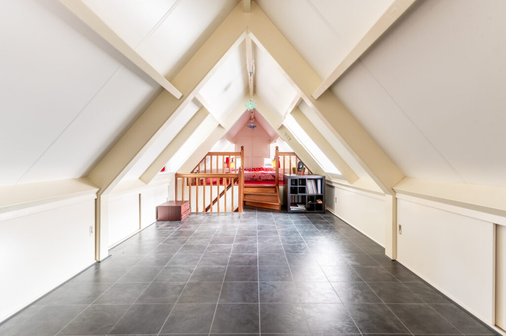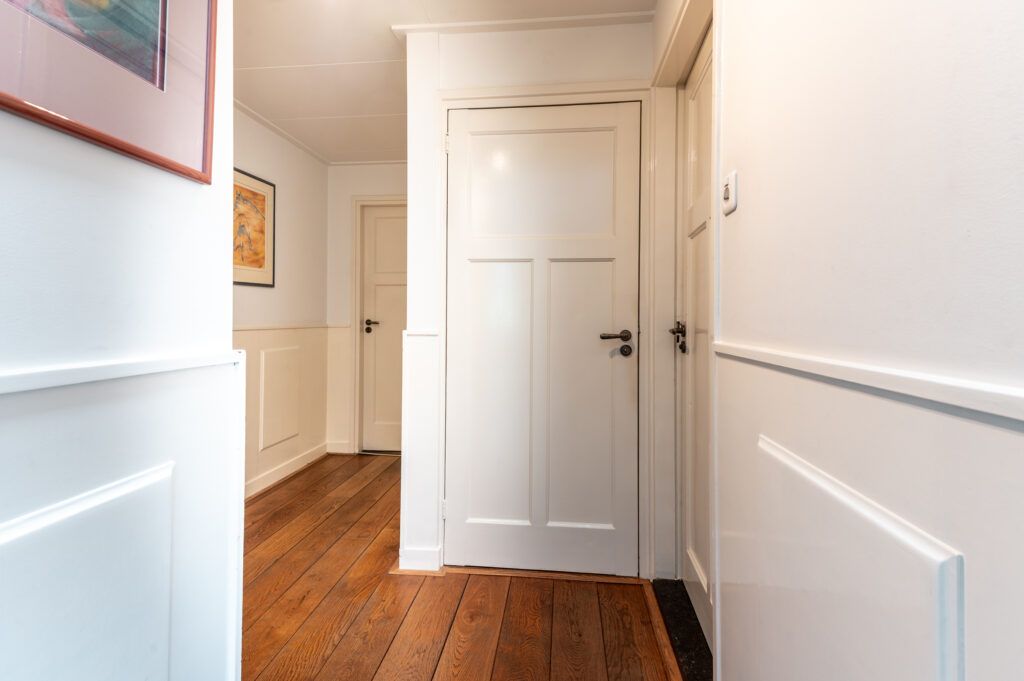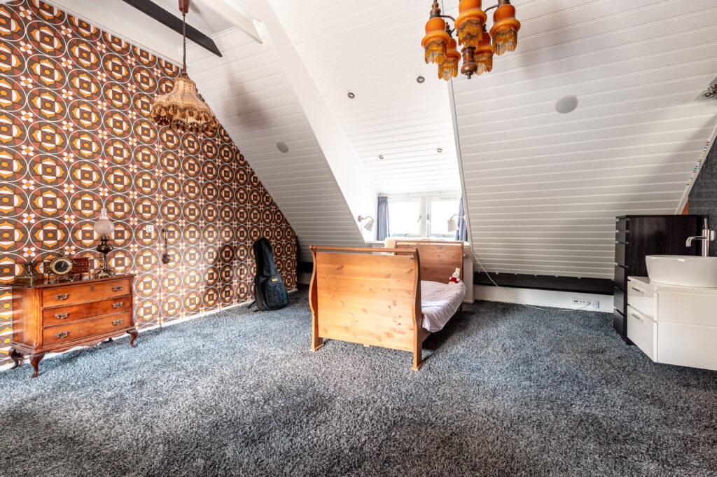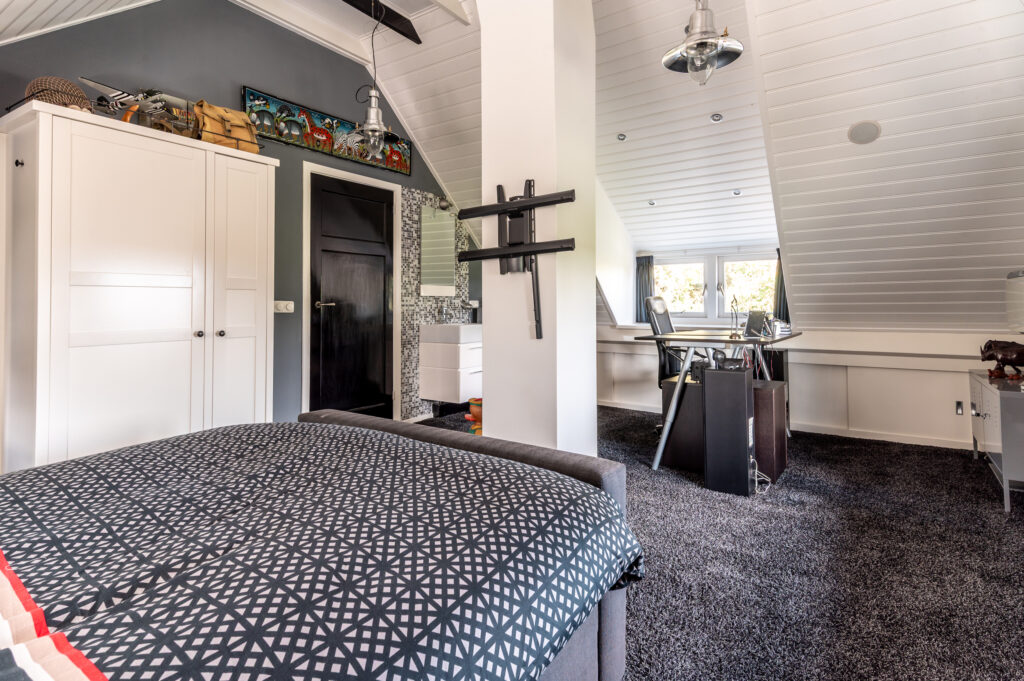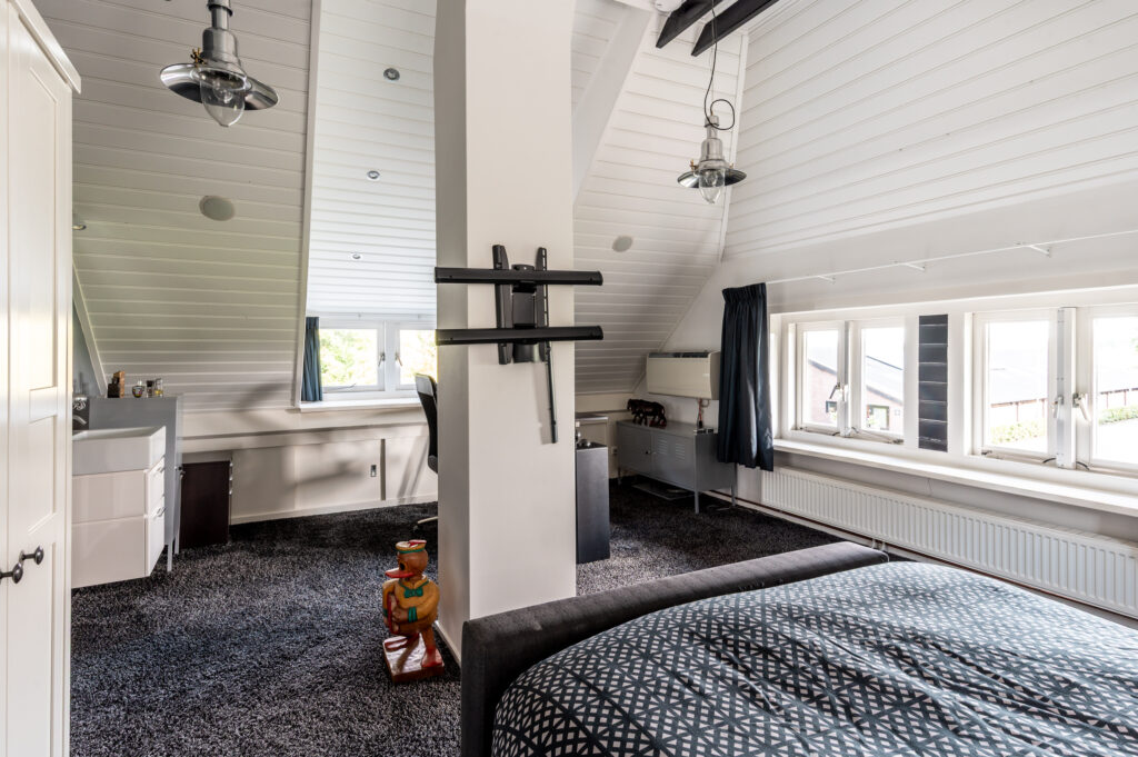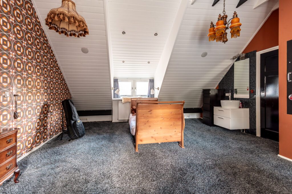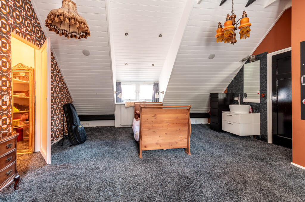De houten trap met vide geeft toegang tot de royale eerste verdieping met ruime overloop en twee slaapkamers (2005). Aan de voorzijde is de eerste slaapkamer met hoge nok, twee dakkapellen, vernieuwde schoorsteen en airco. Ook is deze kamer voorzien van een wastafel. De slaapkamer rechts heeft eveneens een hoge nok, twee dakkapellen, een wastafel én een walk in closet. Tevens is de CV-ruimte hier gesitueerd.