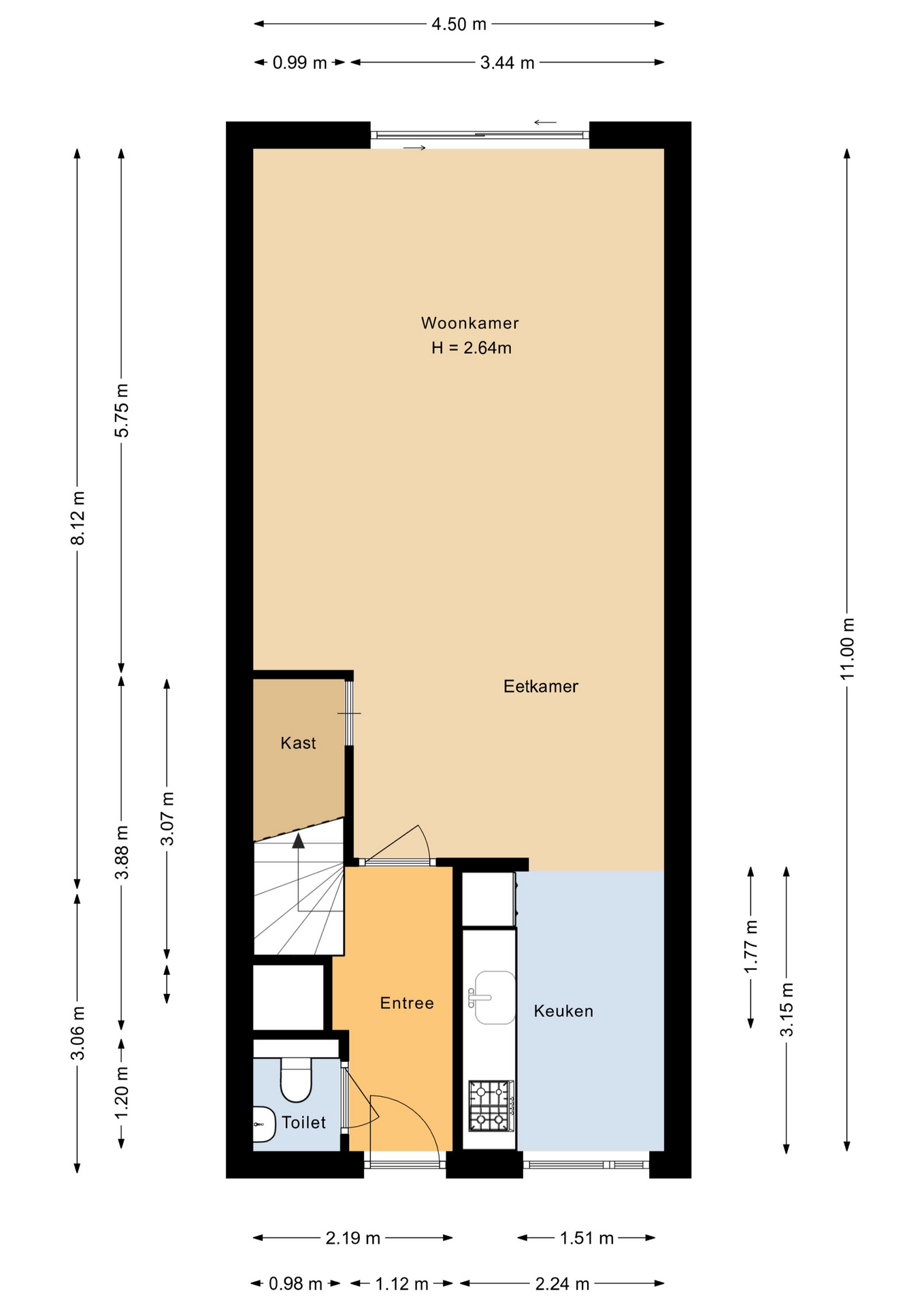 Entree, hal met trapopgang en meterkast. De toiletruimte is geheel betegeld en voorzien van een wandcloset en fonteincombinatie. Ruime woonkamer met openslaande deuren naar de achtertuin. Aan de voorzijde van de woning treft u de open keuken. De keukenopstelling in lichte kleurstelling is voorzien van diverse inbouwapparatuur, vanaf deze ruimte heeft u vrij zicht over een groenvoorziening.