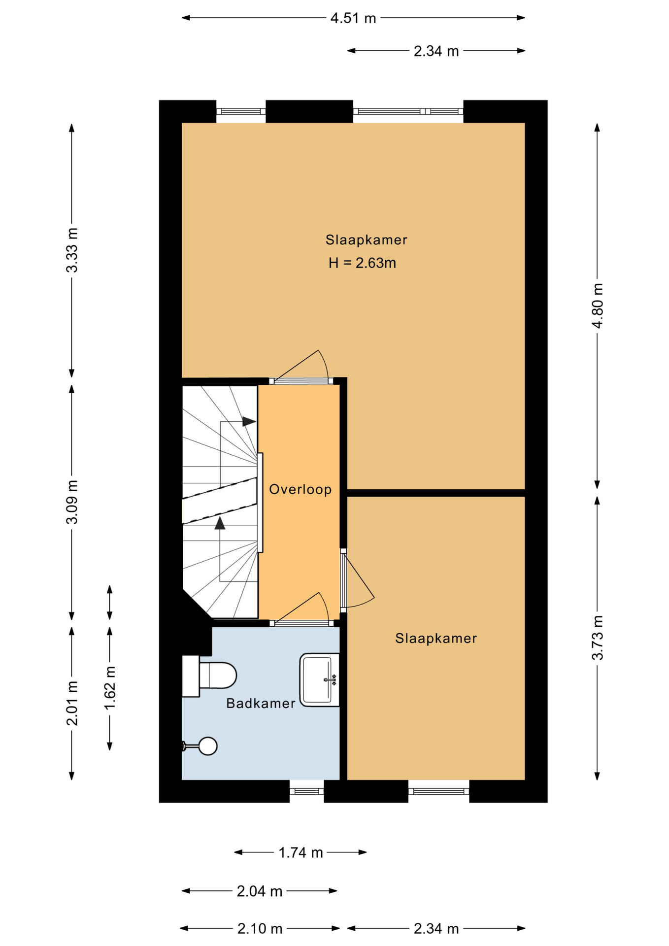 Overloop met toegang tot twee slaapkamers en de badkamer. De badkamer is voorzien van wand- en vloertegels, douchegelegenheid, wastafel en toilet.