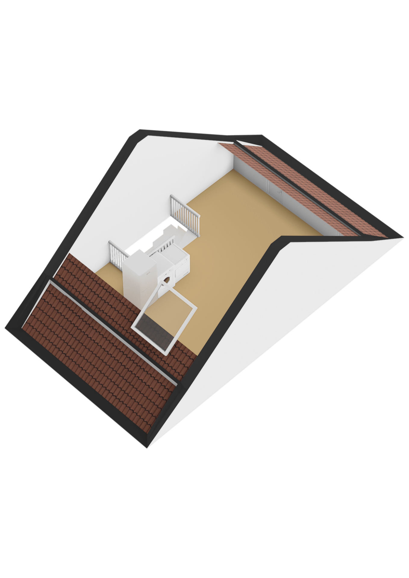 Open zolderruimte met de opstelplaats van de warmtepomp en de aansluiting voor de wasmachine en droger. Deze ruimte biedt de mogelijkheid om eenvoudig een extra slaapkamer te realiseren.