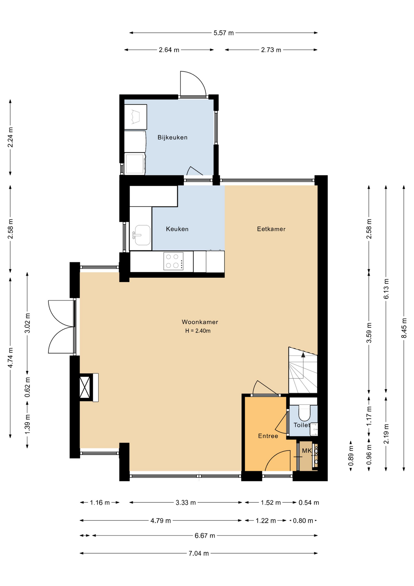 Entree, met meterkast en toilet. Via de stoere, zwarte deur met glaspartij, komt u in de royale woonkamer, deze is mede zo ruim geworden door de aanbouw aan de zijkant van de woning. De ramen tot aan de grond zorgen voor mooi natuurlijk lichtinval. De woonkamer beschikt over dubbele terrasdeuren naar de tuin en aan de voorzijde is er vrij uitzicht! Aansluitend treft u de gezellige zithoek aan en de trapopgang naar de 1e verdieping. In de halfopen keuken bevindt zich een modern U–vormig keukenblok (2020) met een composiet aanrechtblad. Deze keuken is voorzien van alle benodigde inbouwapparatuur, te weten: vaatwasmachine, combi-oven, koelkast, kookplaat en afzuigkap. Aansluitend is de praktische bijkeuken, hier is een wasmachine- en drogeraansluiting aanwezig.