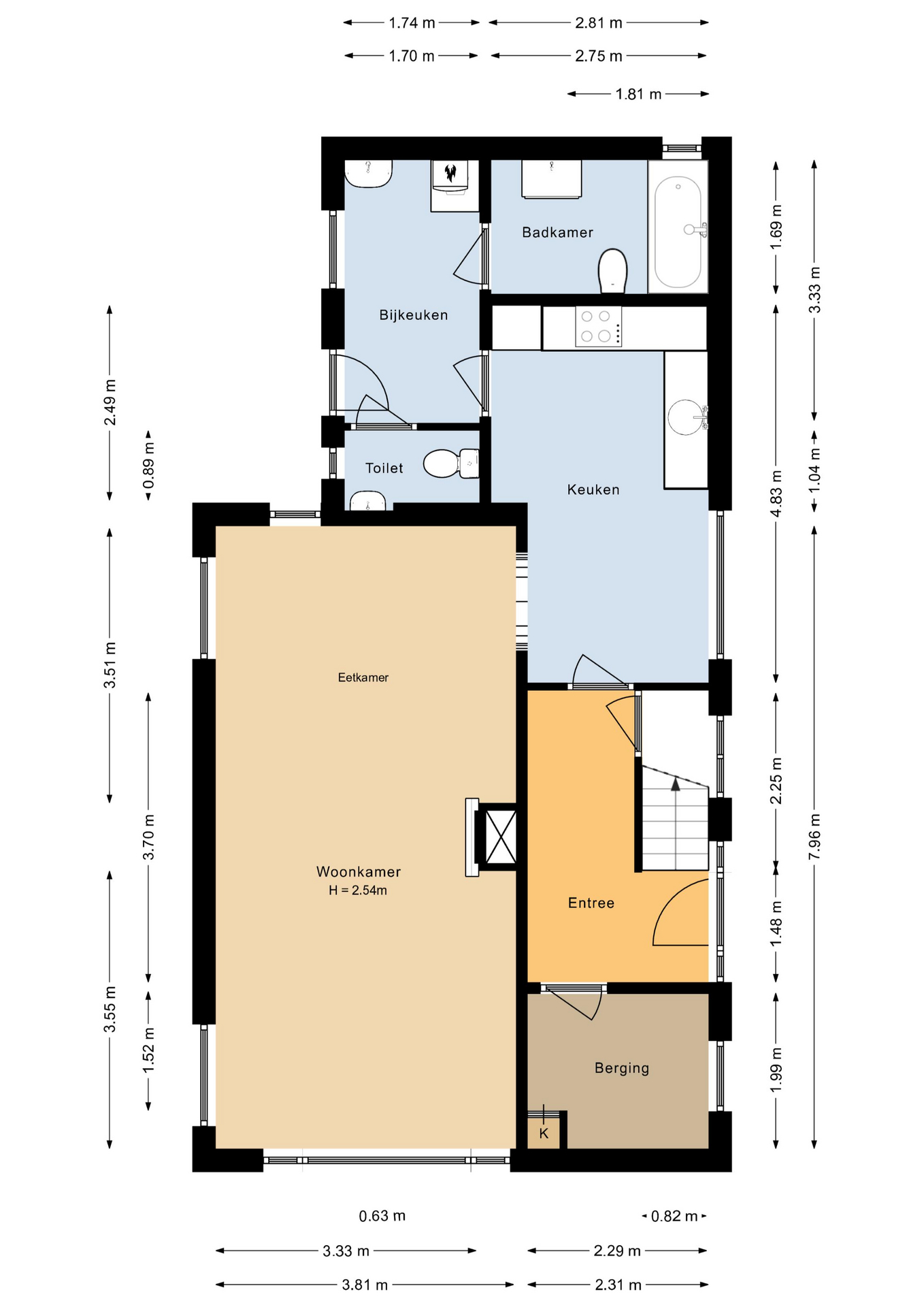 Via de authentieke halfronde voordeur, omlijst met glas in loodramen, komt in de hal. De woonkamer is aan de voorzijde van de woning gelegen en voorzien van een schouw met openhaard. De ruime keuken met L-vormige keukenblok is voorzien van diverse inbouwapparatuur. Aansluitend de bijkeuken en badkamer. In de bijkeuken is de opstelling van de Cv-ketel en de aansluiting voor de wasmachine. De badkamer beschikt over een ligbad met douchegelegenheid, wastafelmeubel en bidet. De toiletruimte is bereikbaar vanuit de bijkeuken.