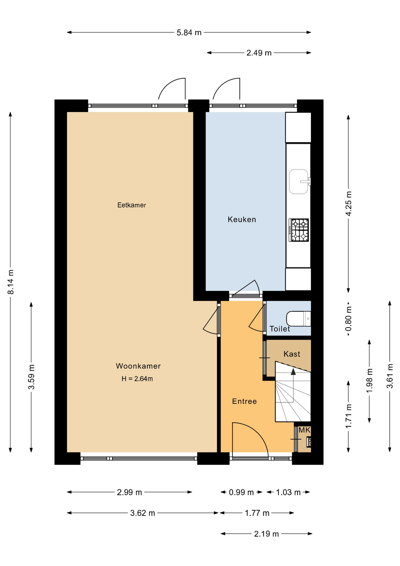 Entree, meterkast, trapopgang en de toiletruimte. De fraaie doorzonkamer met aan de voorzijde vrij zicht, is voorzien van een visgraat PVC-vloer. Ruime woonkeuken met recht keukenblok voorzien van diverse inbouwapparatuur.