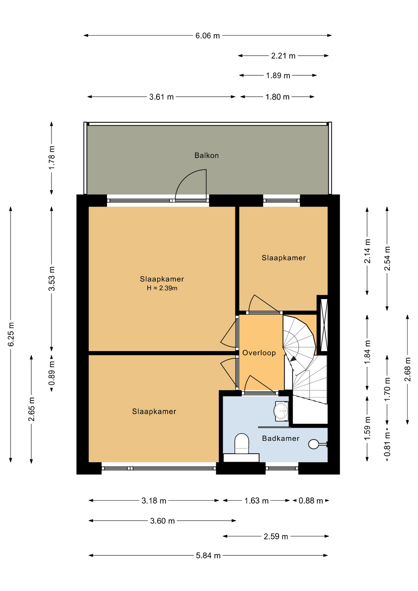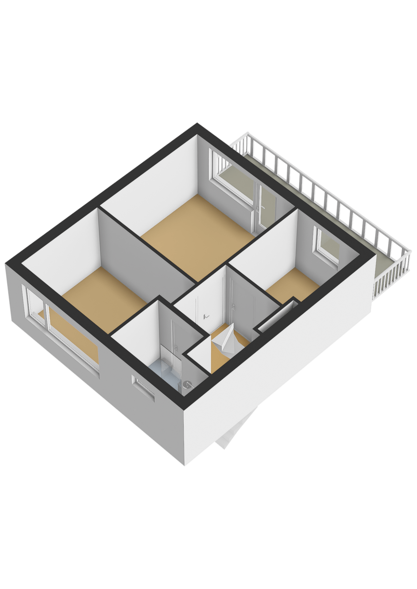 Overloop. Drie slaapkamers. De grote slaapkamer aan de achterzijde geeft toegang tot een balkon. Vernieuwd moderne badkamer met douchegelegenheid, 2e toilet en een wastafel. Via vaste trap te bereiken.