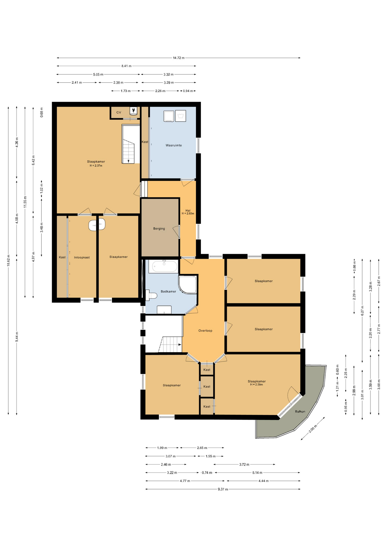 Ruime overloop met kastruimte. Vier slaapkamers, waarvan twee slaapkamers voorzien zijn van vaste kasten en een van de slaapkamers toegang geeft tot het balkon. Geheel betegelde badkamer met ligbad, stoomdouche, wandcloset en badkamermeubel. Middels een hal bereikt u nog twee slaapkamers en een extra ruimte die gebruikt kan worden als kantoor of als walk-in-closet. Wasruimte met aansluiting voor wasmachine en droger