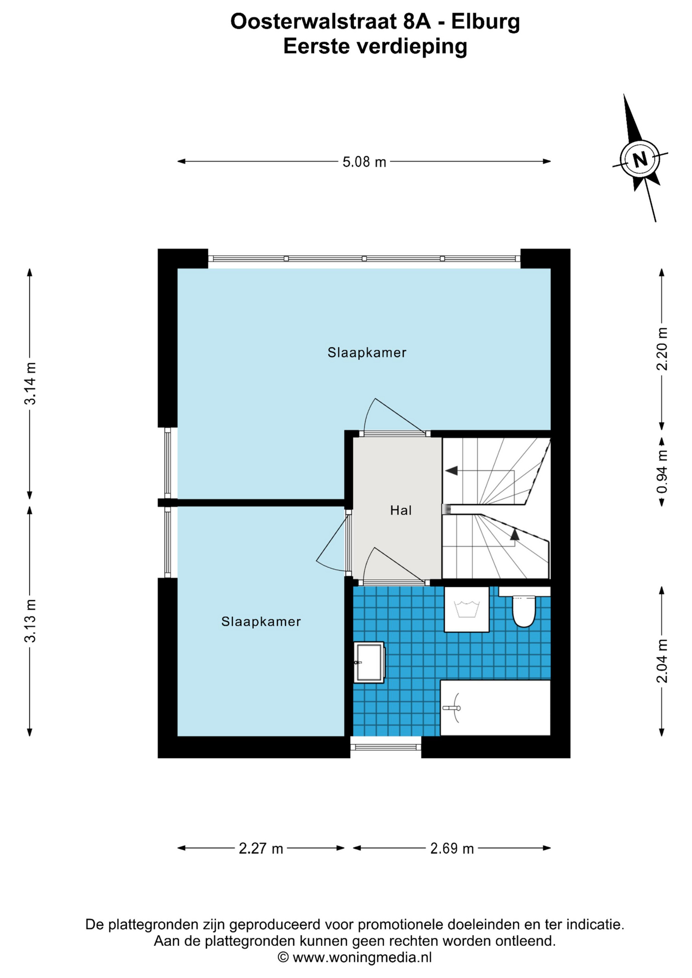 De overloop geeft toegang tot twee slaapkamers, groot resp. ca. 14,7 m² en 7,1 m².