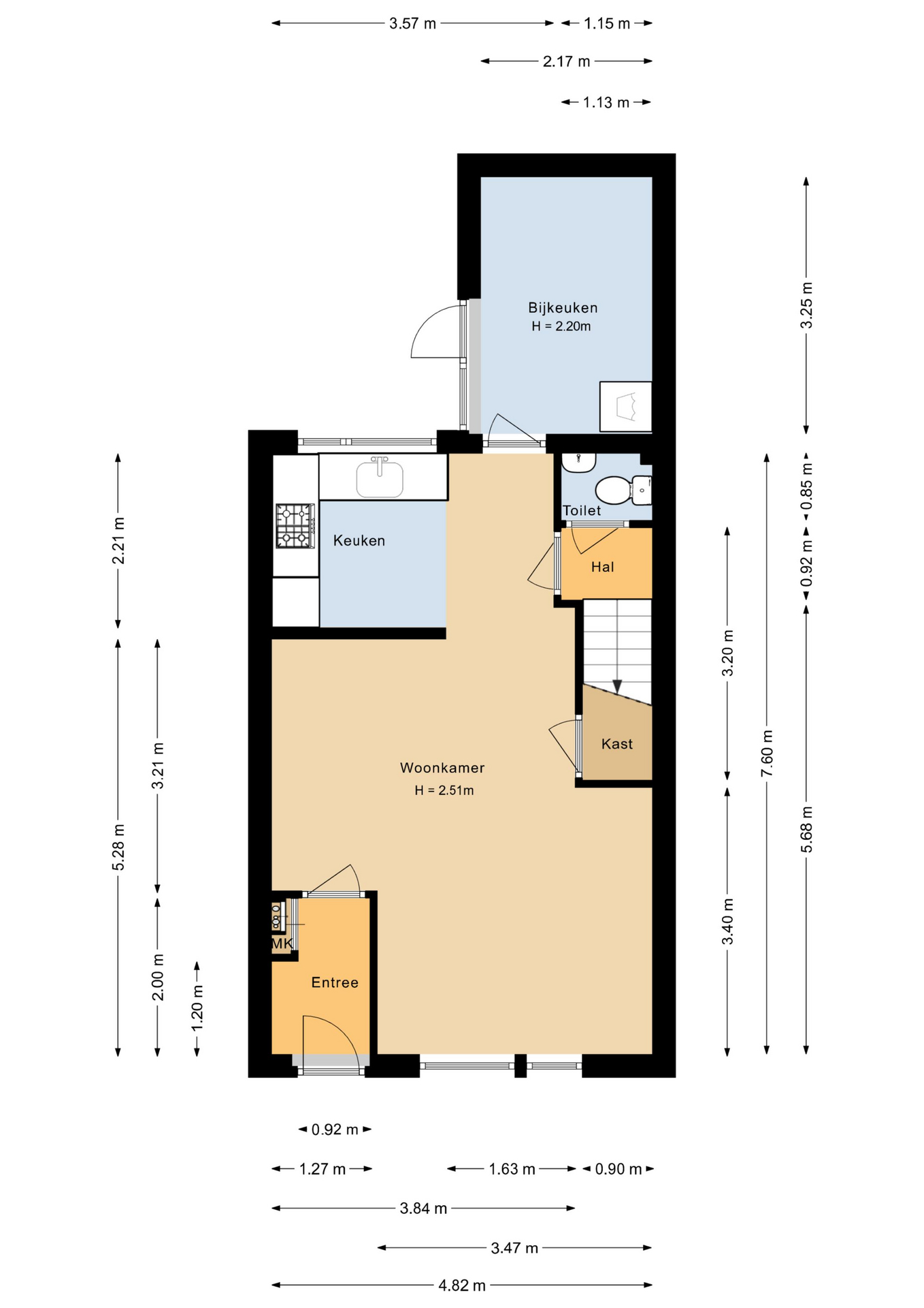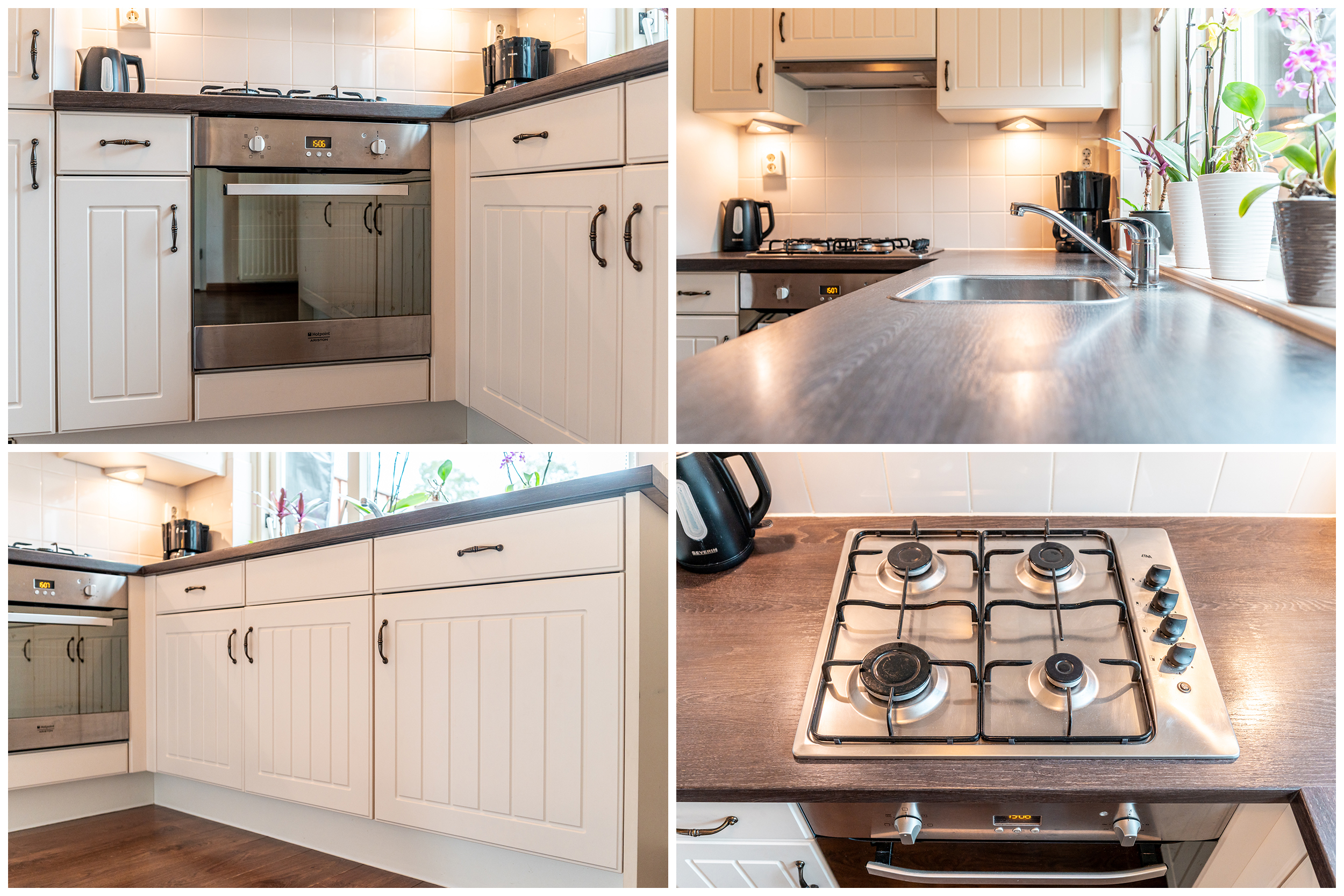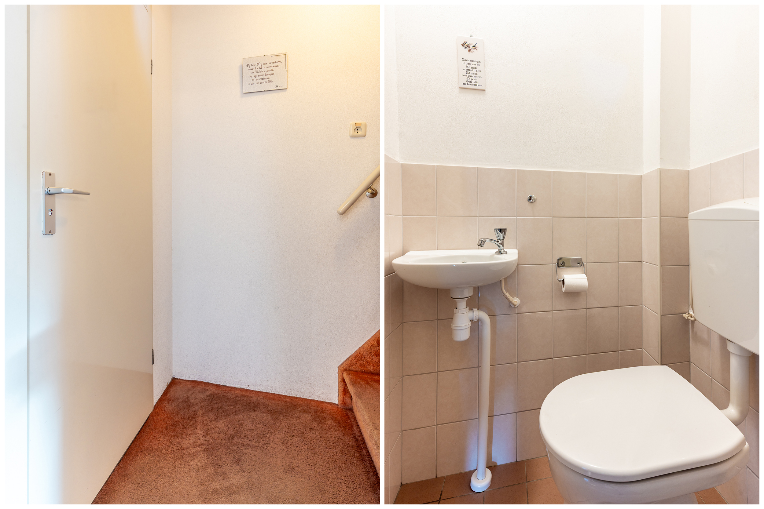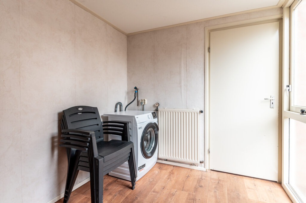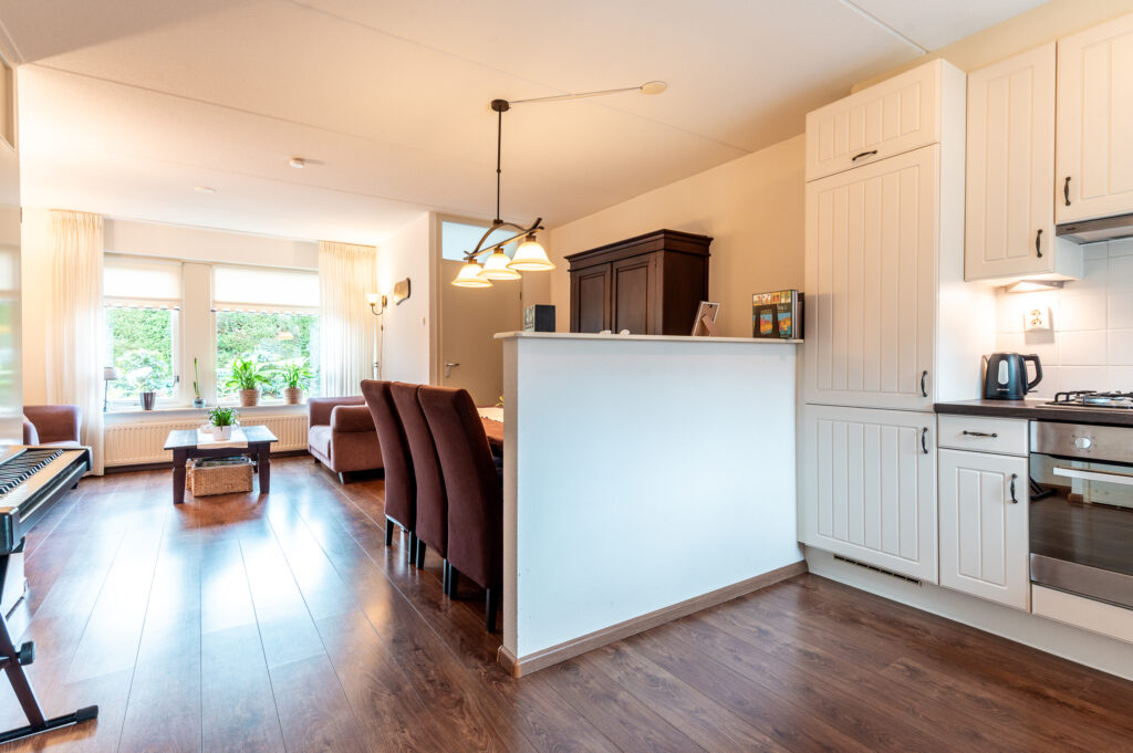 Entree met de meterkast. De lichte woonkamer beschikt over een praktische trapkast. De open keuken is ingericht met een hoekopstelling in lichte kleurstelling en voorzien van inbouwapparatuur. Tussenhal, daar bevindt zich de toiletruimte en de trap naar de eerste verdieping. Aangrenzend de bijkeuken met de aansluiting voor de wasmachine en toegang tot de tuin.