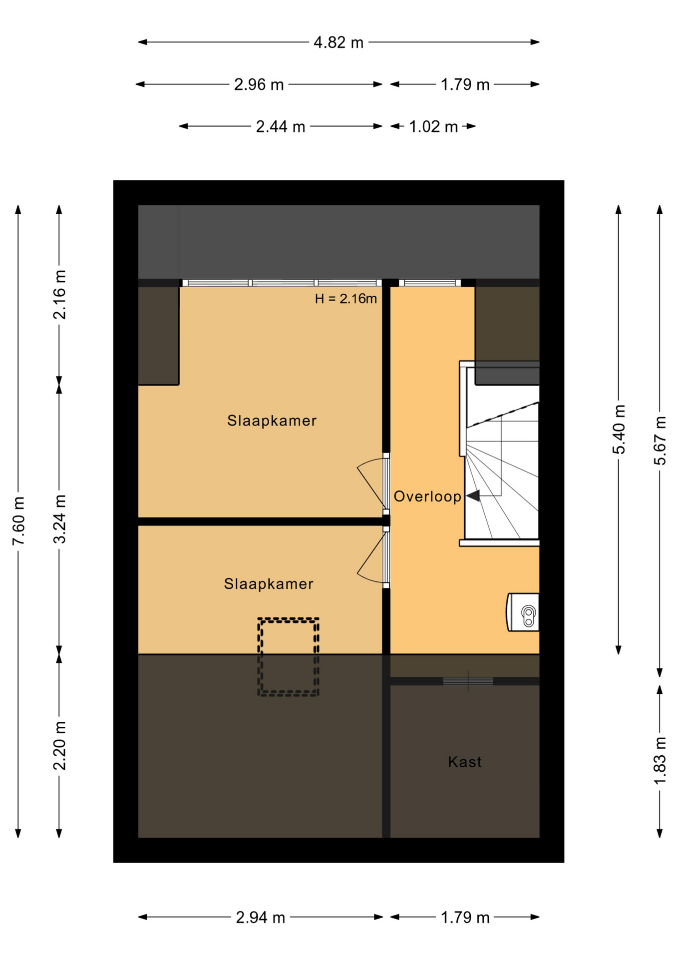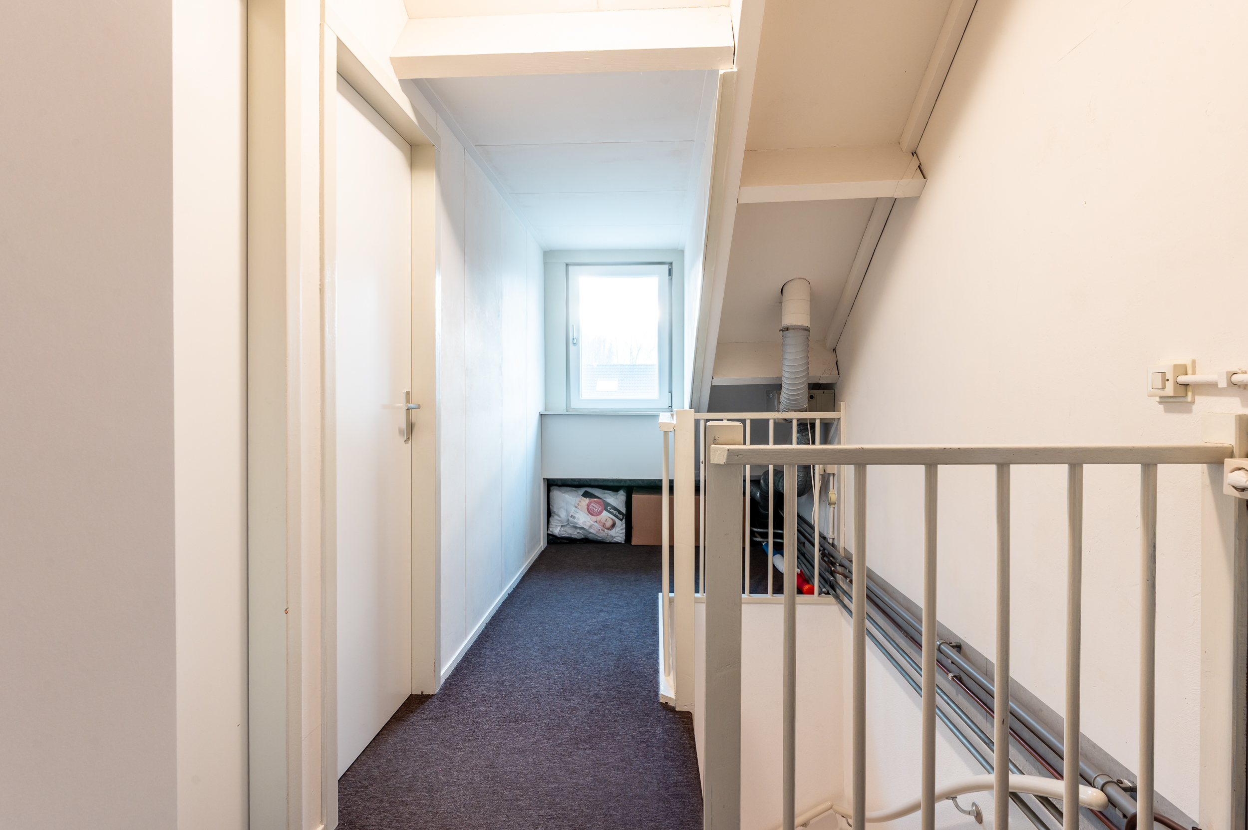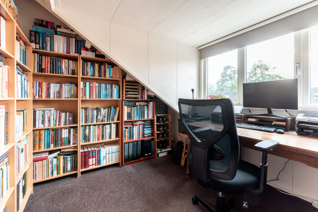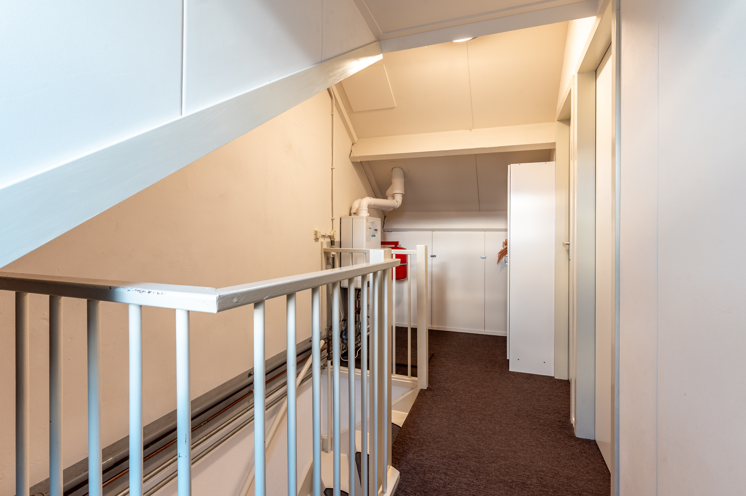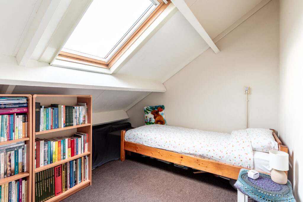 Overloop met de opstelling van de Cv-ketel en bergruimte in het knieschot. Deze tweede verdieping biedt nog twee extra slaapkamers. Dit maakt de woning bijzonder geschikt voor grotere gezinnen of voor wie extra werk- of hobbyruimte zoekt. De verdieping voelt licht en ruim dankzij de aanwezigheid van een dakraam aan de voorzijde en een mooie dakkapel aan de achterzijde.