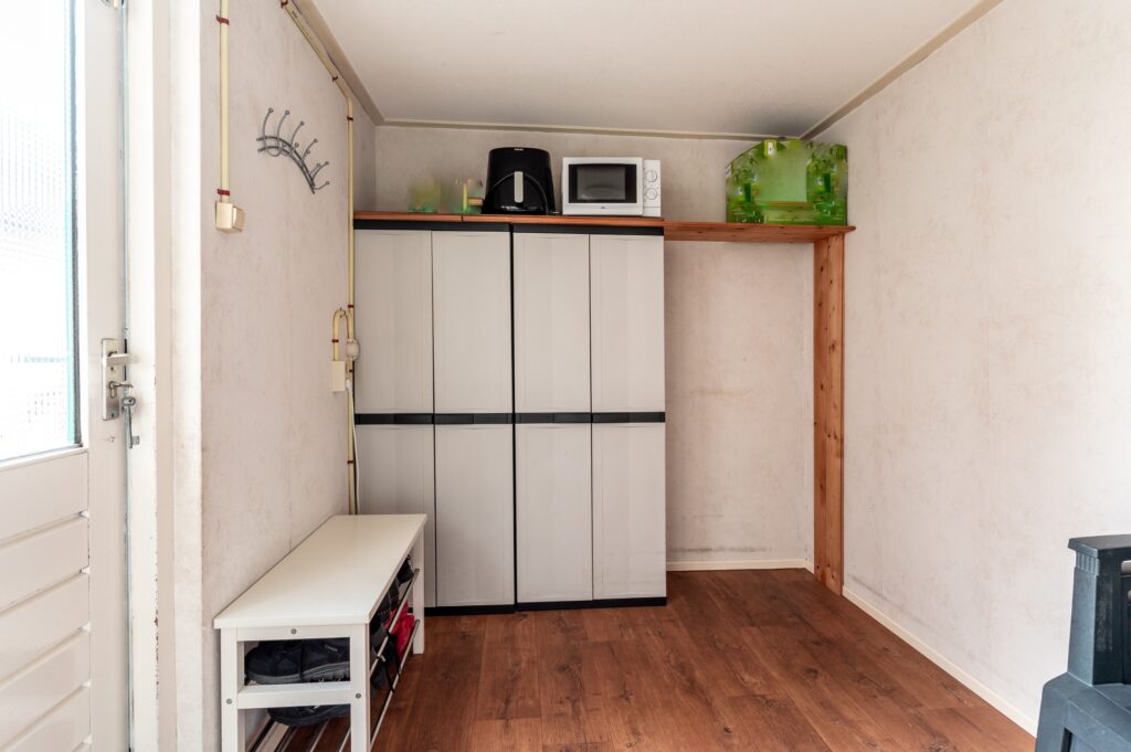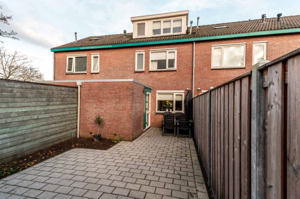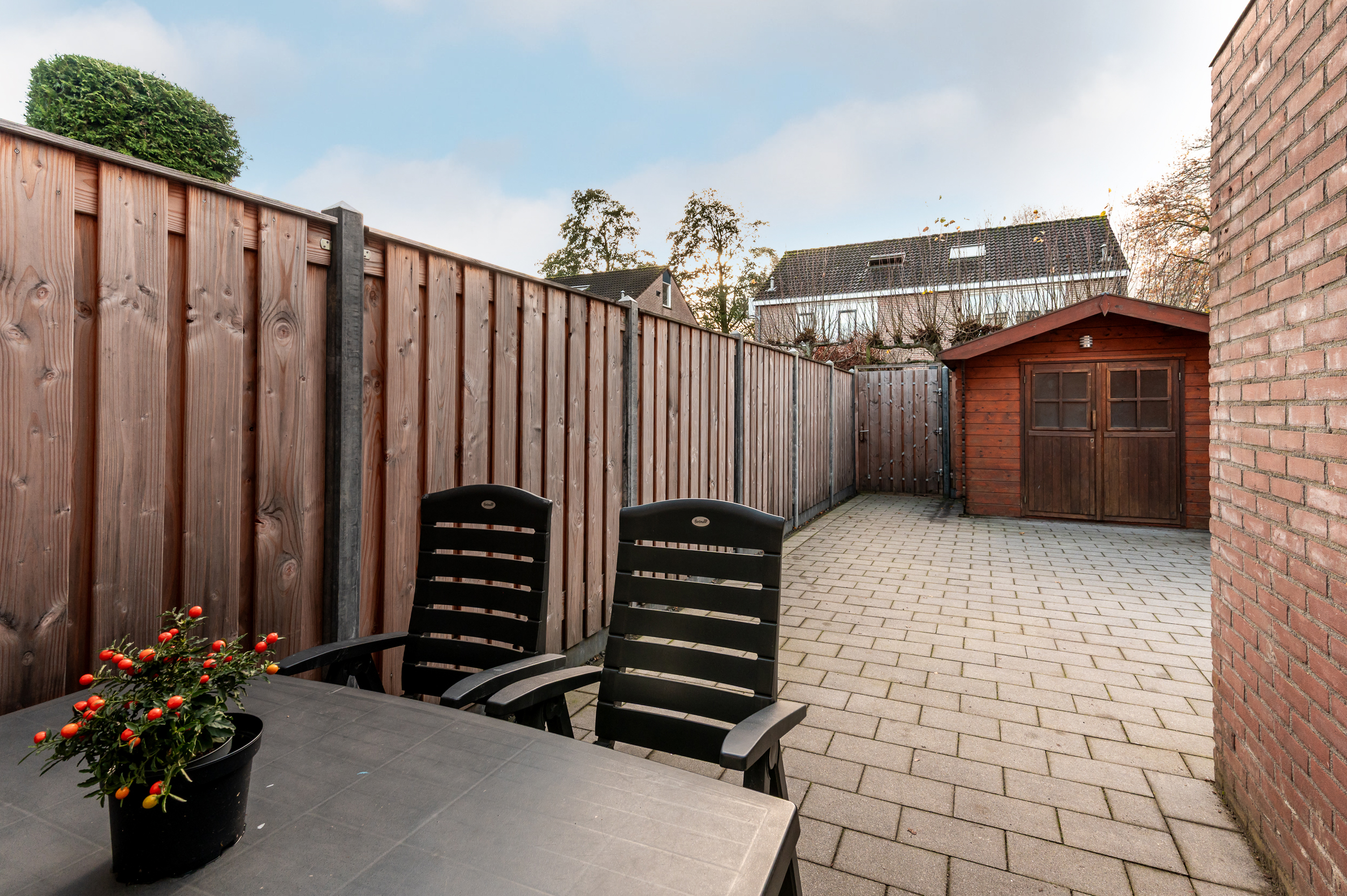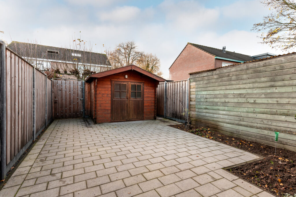 De achtertuin is gunstig gelegen op het zonnige zuidwesten, waardoor je hier de hele dag door heerlijk kunt genieten. Achterin de tuin vind je een houten berging en een handige achterom.