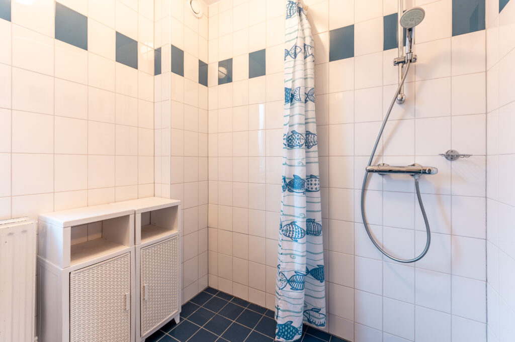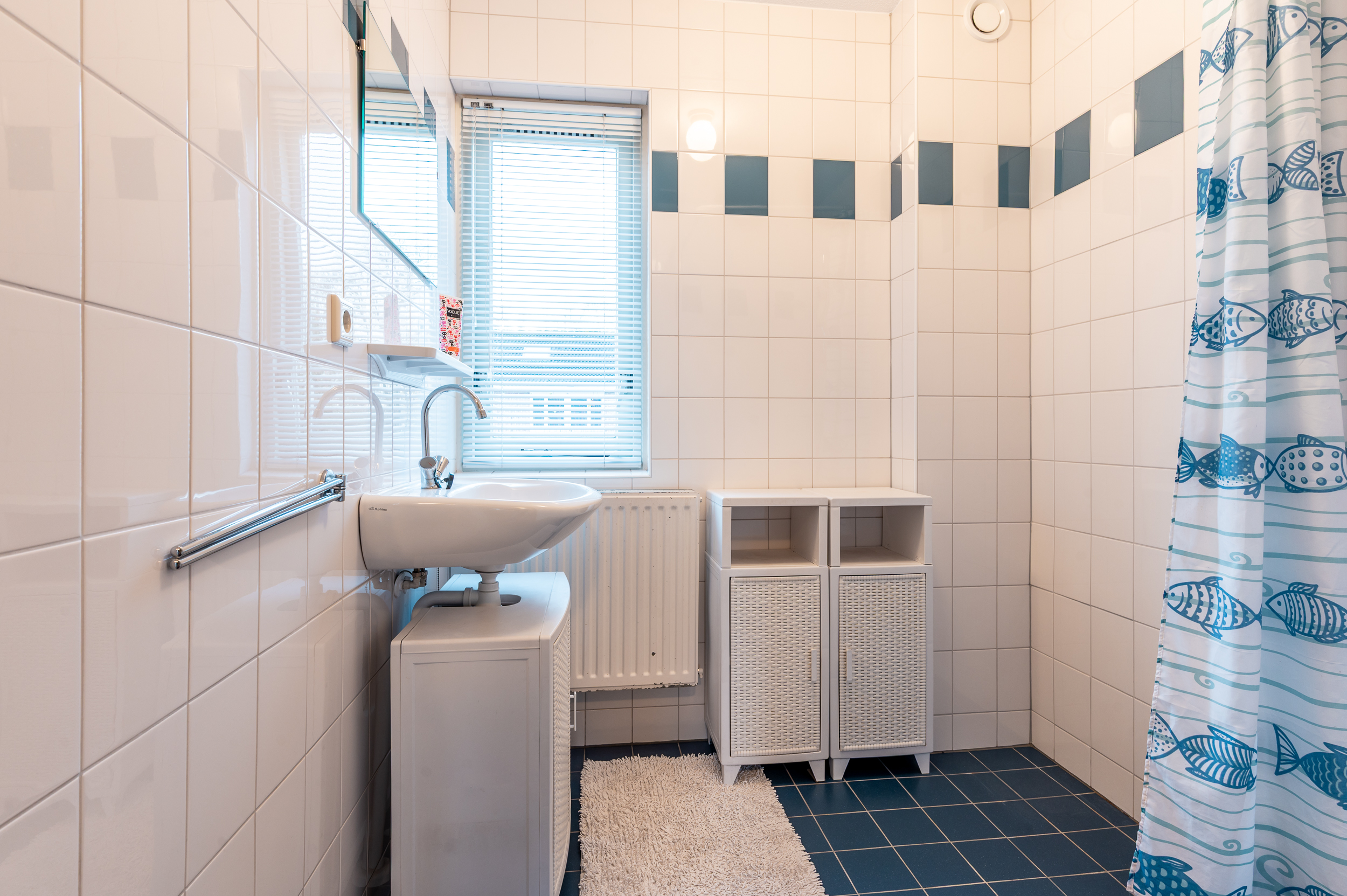Overloop met toegang tot drie slaapkamers. De kleine slaapkamer aan de voorzijde beschikt over een vaste kast. De badkamer is geheel betegeld en voorzien van een douchegelegenheid en wastafel.