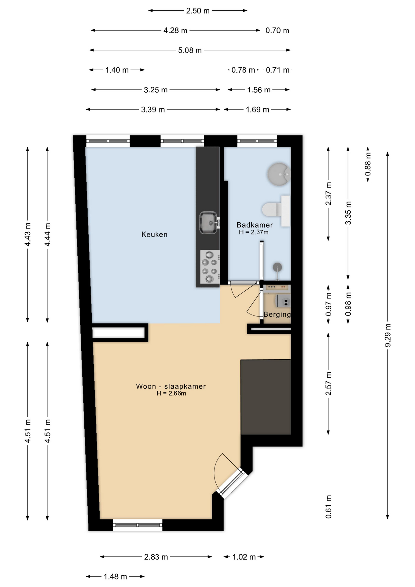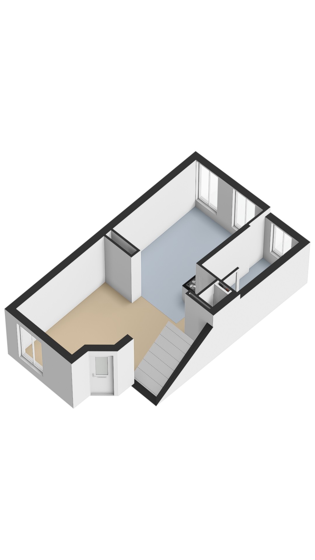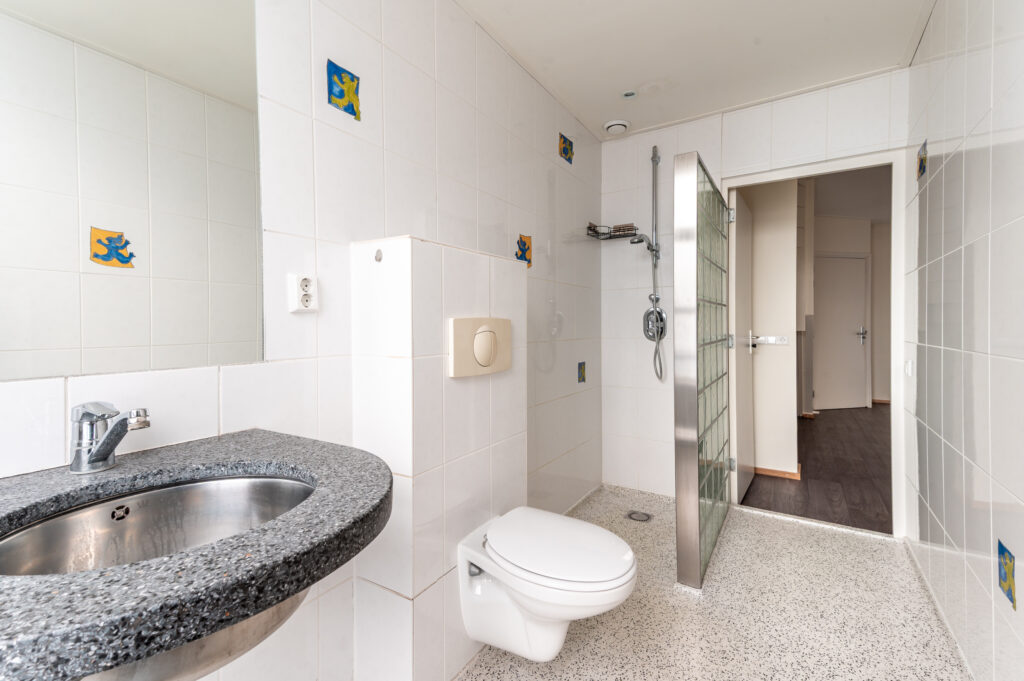 Via de achteringang bereikt u de woning op de eerste verdieping. De studio beschikt over een lichte woonkamer met slaapgelegenheid. Aan de voorzijde bevindt zich een royale woonkeuken met een recht keukenblok, voorzien van diverse inbouwapparatuur. De ruime badkamer is uitgerust met een wastafel, douche en toilet.