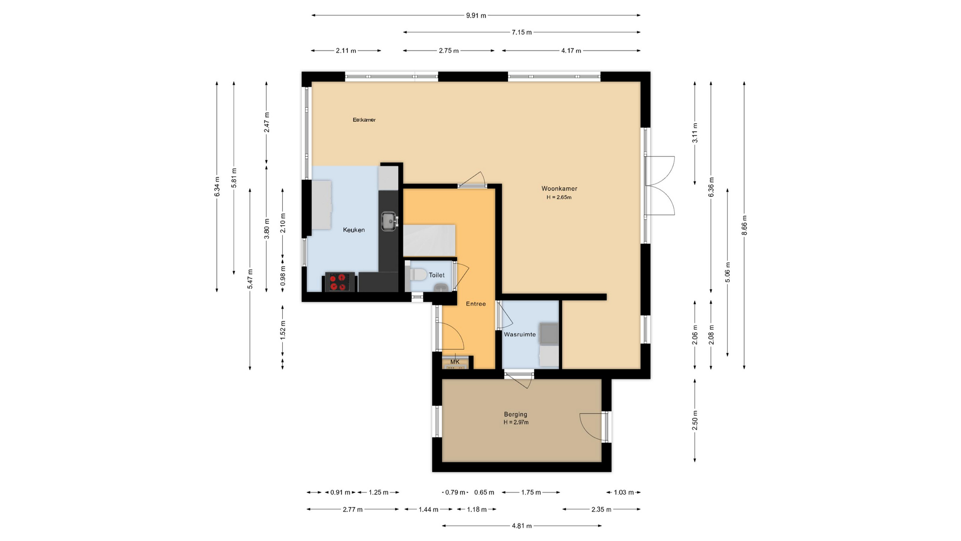 Het entree biedt toegang het toilet, de bijkeuken en de woonkamer. De royale L-vormige woonkamer van ca. 42 m² met vaste kastenwand, heeft openslaande deuren naar tuin en overkapping.