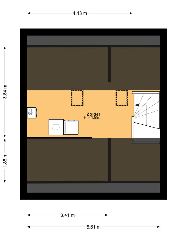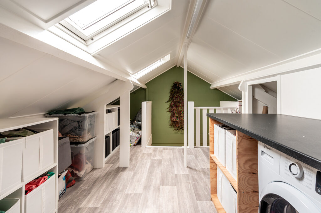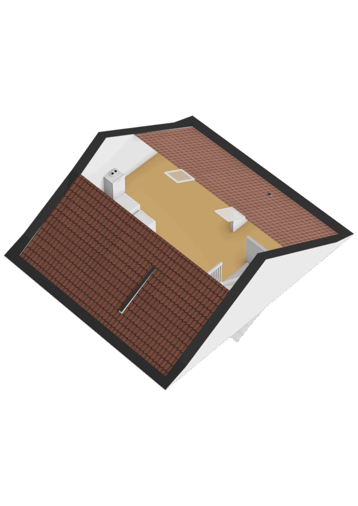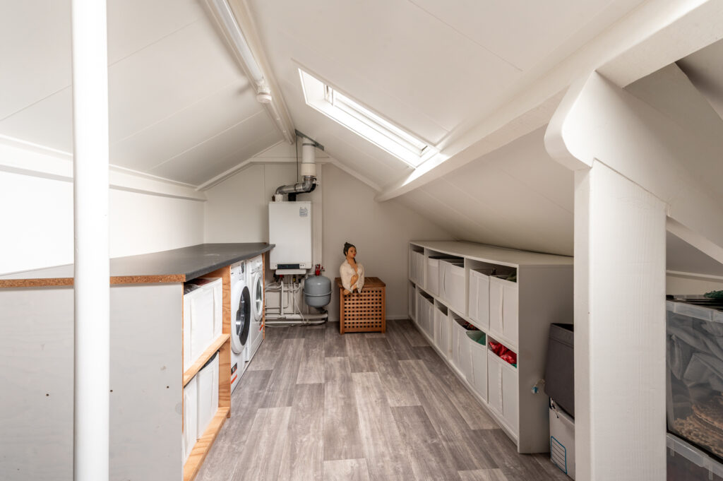 De ruime zolderverdieping is bereikbaar via een vaste trap en voorzien van twee dakramen. Deze ruimte biedt volop mogelijkheden voor het realiseren van een vierde slaapkamer, een kantoor of hobbyruimte. Daarnaast vind je de Cv-opstelling en de aansluiting voor de aansluitingen voor de wasmachine en droger.