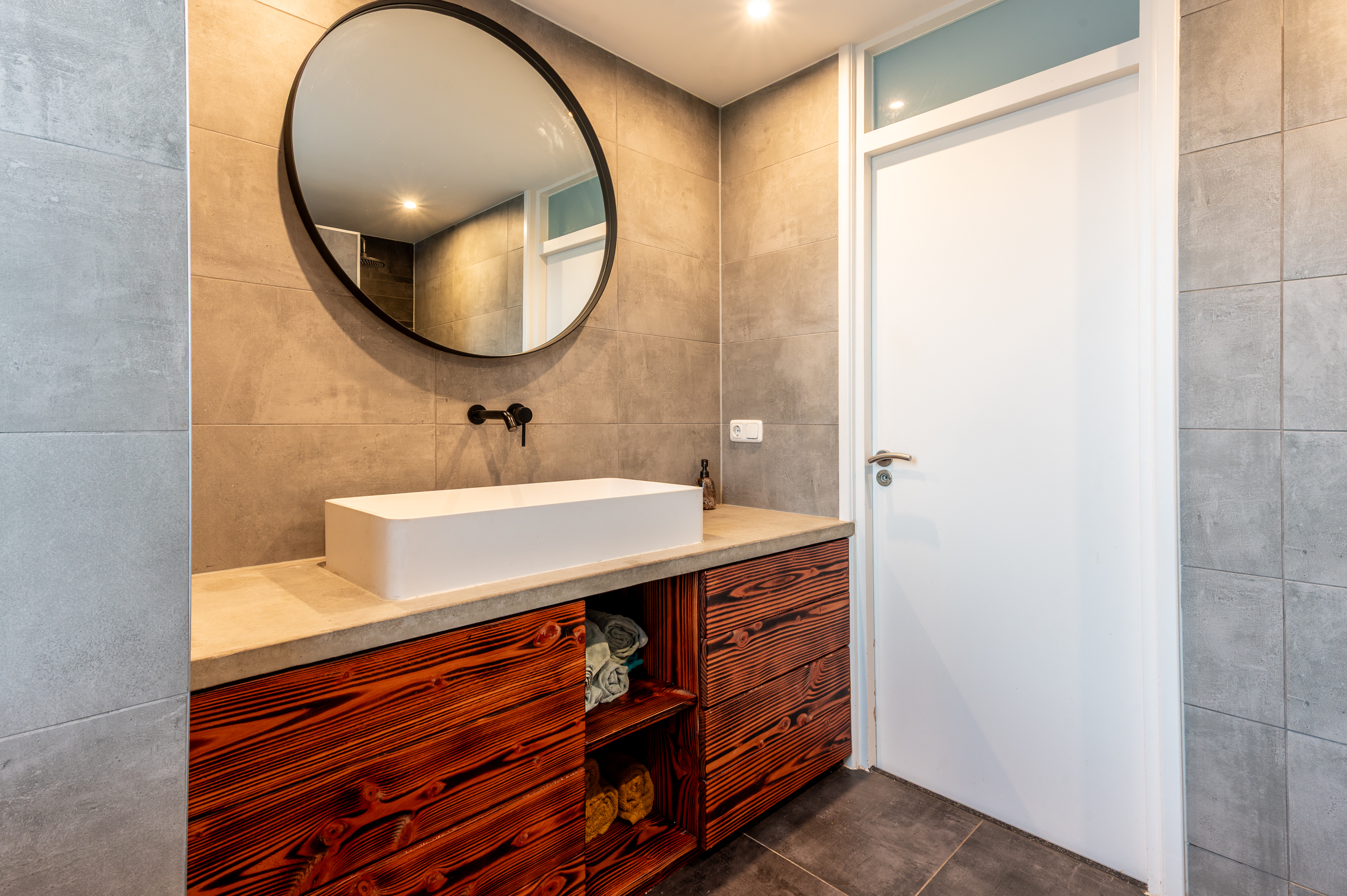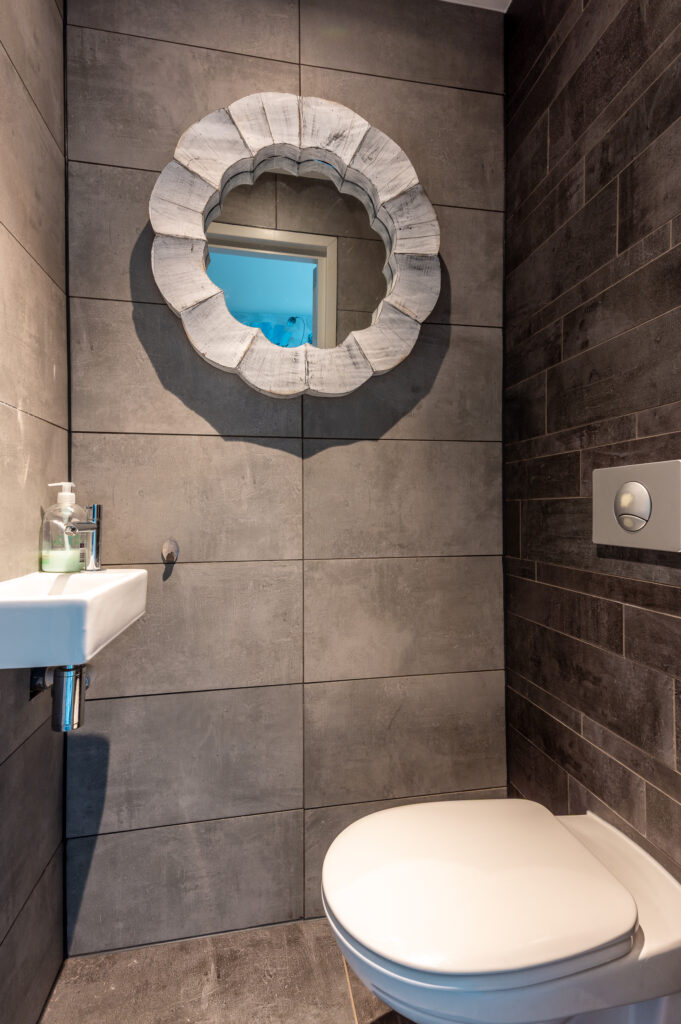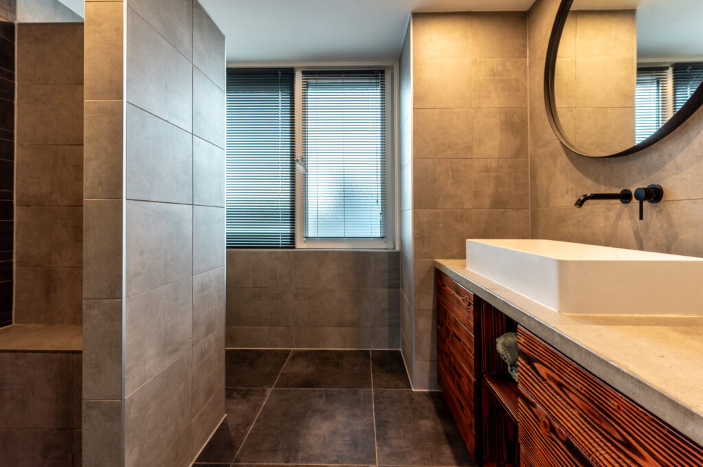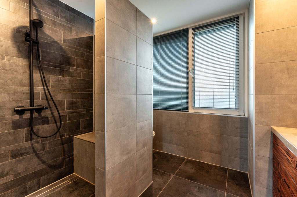 De vernieuwde trapopgang met gedimde verlichting geeft toegang tot de overloop en drie slaapkamers. De moderne badkamer is compleet en stijlvol ingericht met een ruime inloopdouche, een wastafelmeubel en een tweede toilet.
