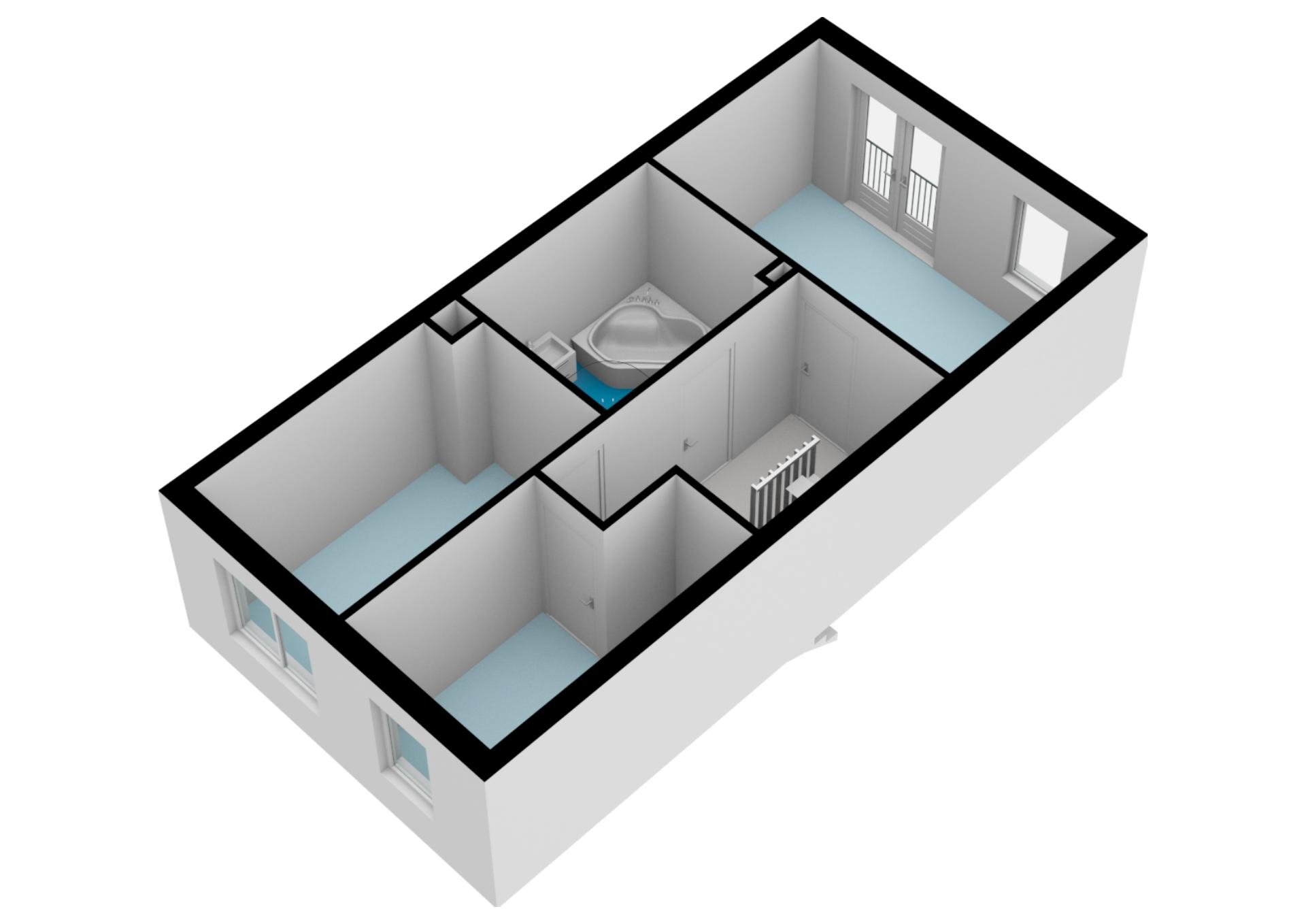 Overloop. Twee slaapkamers zijn aan de achterzijde van de woning gelegen. De badkamer is ruim en voorzien van alle gemakken, te weten; ligbad, douchecabine, was meubel en 2e toilet. De slaapkamer aan de voorzijde is over de gehele breedte van de woning gesitueerd en heeft twee openslaande deuren met een frans balkon.