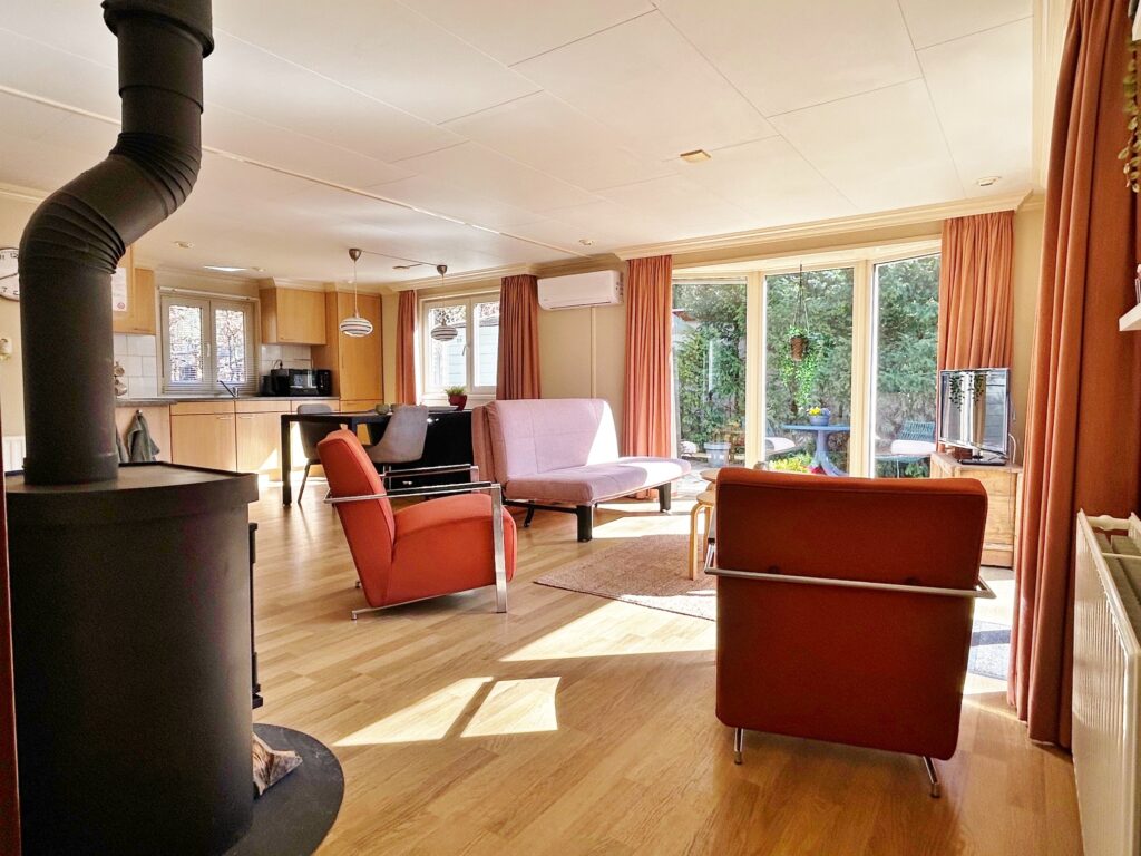 Via de hal met garderobehoek bereikt u de ruime woonkamer. De woonkamer heeft veel lichtinval door de aanwezigheid van een erkertje en de diverse raampartijen met aan de voorkant een schuifpui. Naast de centrale verwarming zorgt een houtkachel in de winter voor behaaglijke warmte. De open keuken met hoekopstelling, beschikt over een combimagnetron en diverse inbouwapparatuur zoals een kookplaat, afzuigkap en een koel-vriescombinatie.