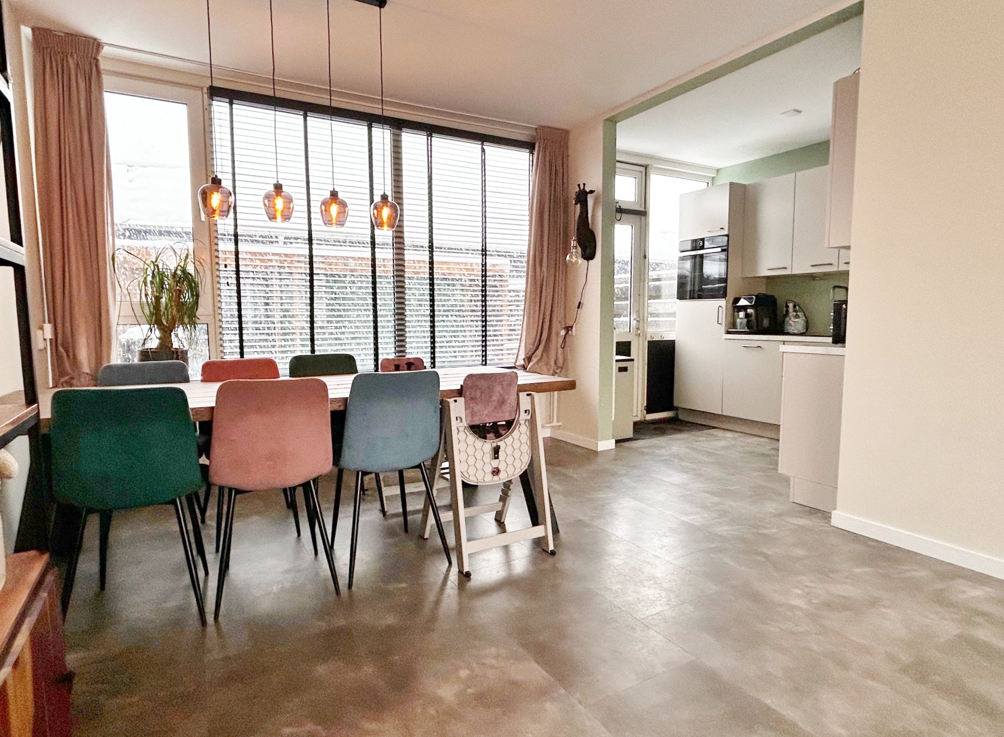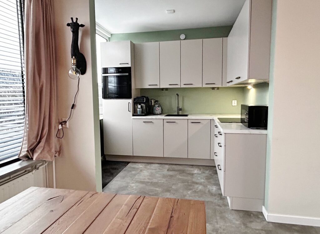 In de halfopen keuken staat een hoekopstelling uitgerust met een inductie kookplaat, vaatwasmachine, koelkast en een hete lucht oven.