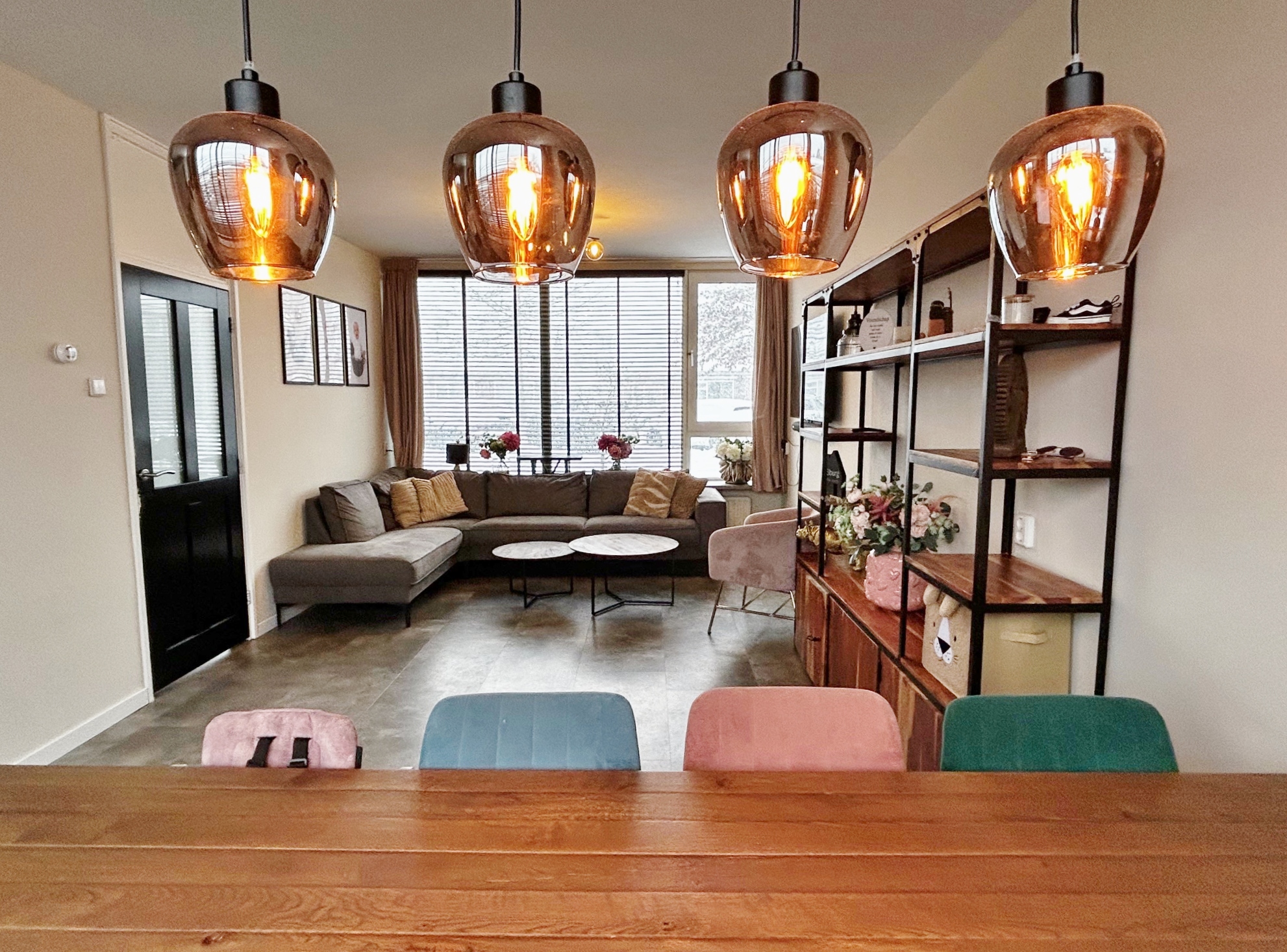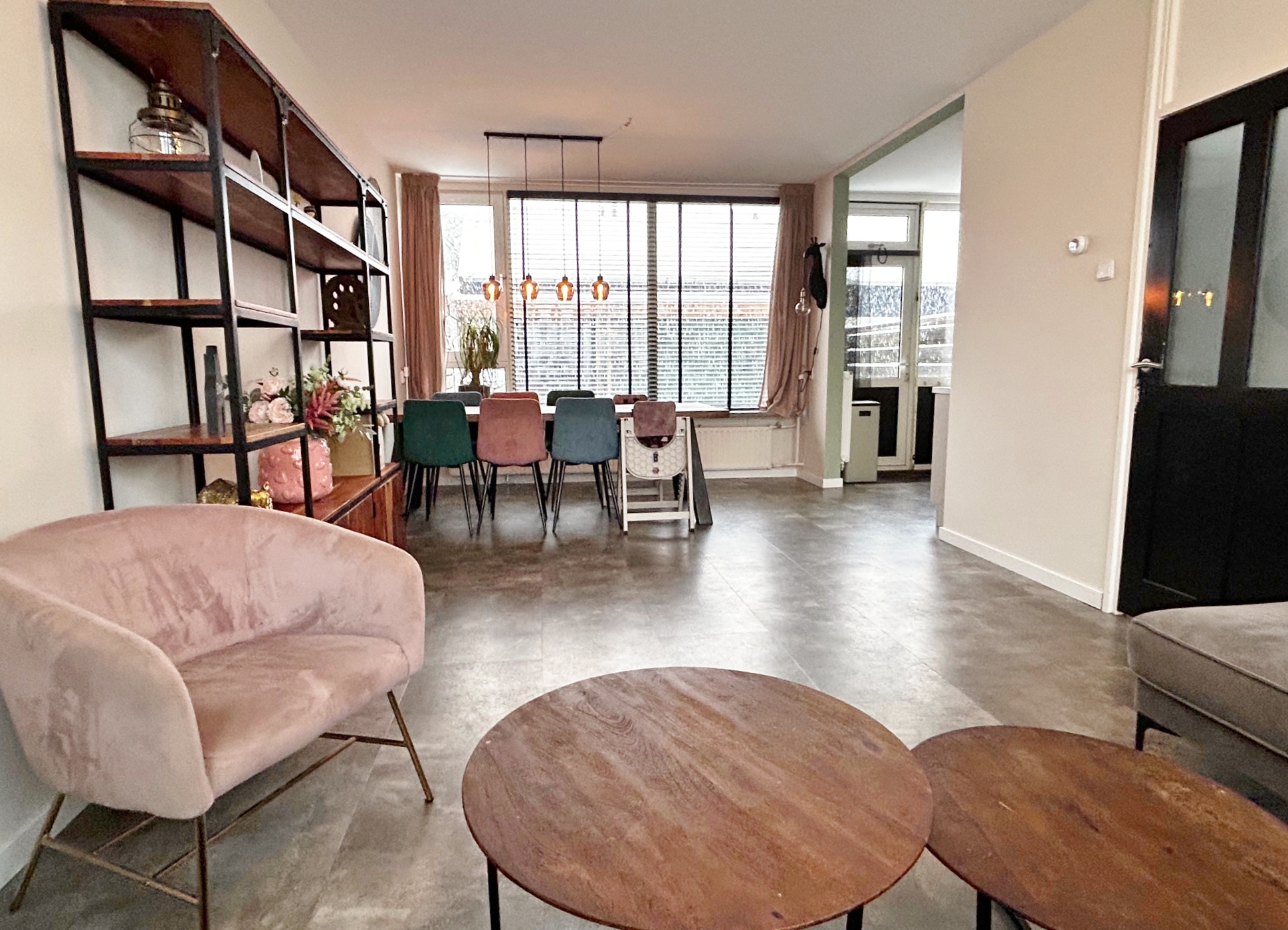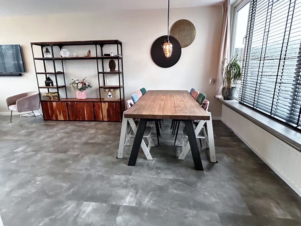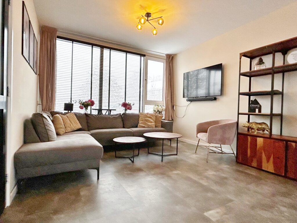 De sfeervolle woonkamer kijk aan de voorzijde vrij uit over gemeentelijk groen en is voorzien van een PVC tegel vloer.