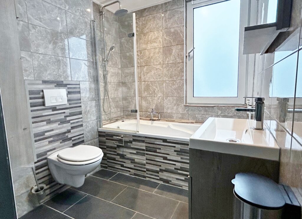 De geheel betegelde badkamer is voorzien van een ligbad met douchescherm, een wastafelmeubel en een vrij hangend toilet.