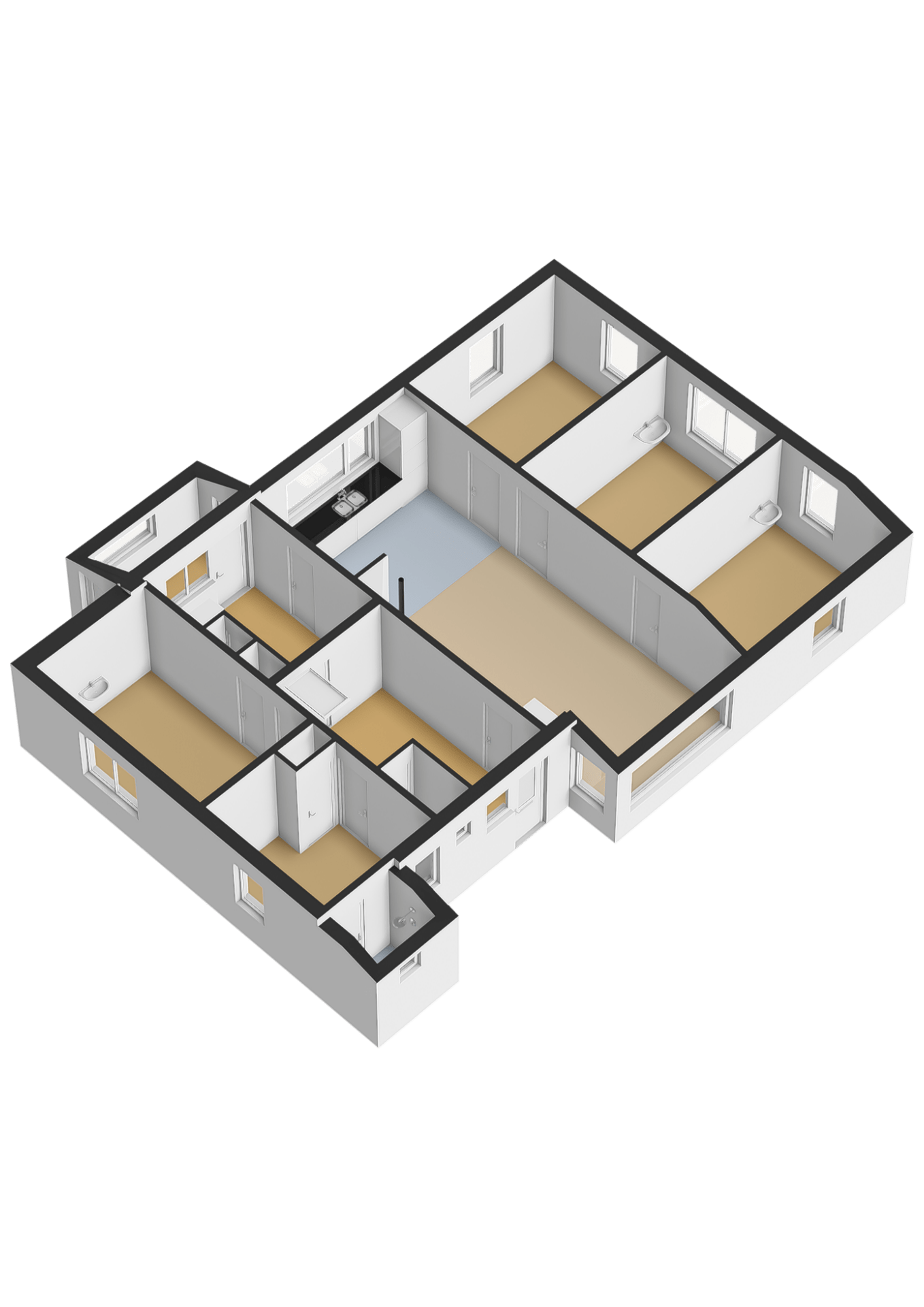 Aan de voorzijde van de woning bevinden zich drie slaapkamers, allen voorzien van een wastafel. De vierde en vijfde zijn aan de achterzijde gelegen. Ook is hier nog een eenvoudige douchegelegenheid aanwezig.