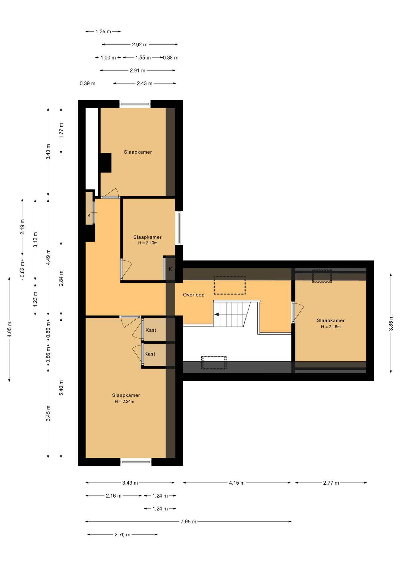 De ruime overloop is voorzien van een dakkapel, waardoor er veel daglicht binnenvalt, en heeft toegang tot 4 slaapkamers. De ouderslaapkamer is aan de voorzijde gelegen en voorzien van een wastafel en vaste kastruimte. De overige drie slaapkamers zijn perfect in te richten als kinderkamer, logeerkamer of werkkamer.