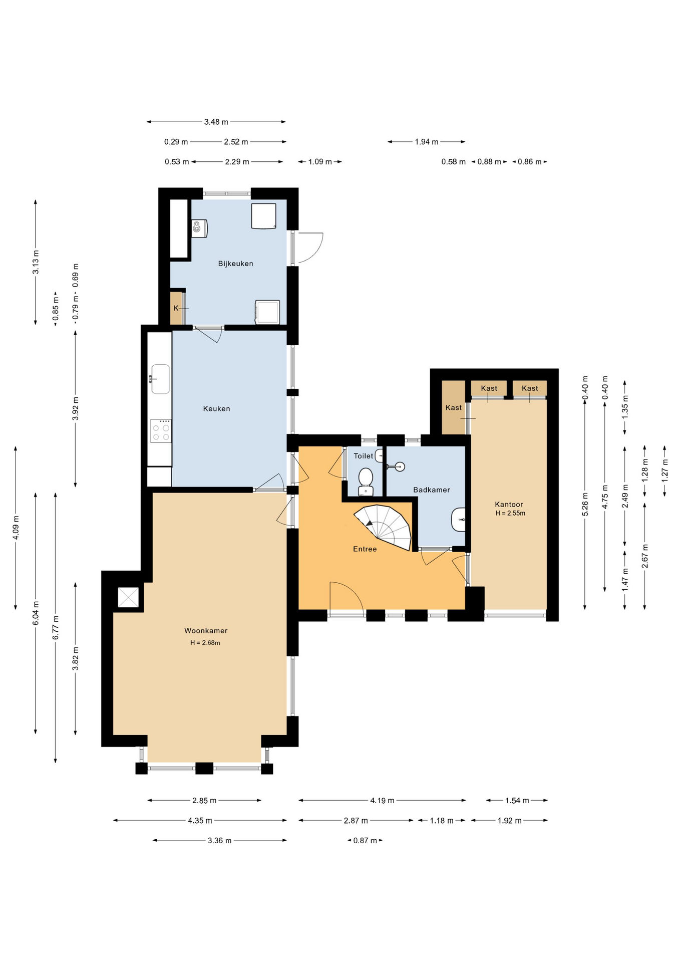 De woonkamer biedt voldoende ruimte voor een comfortabele zithoek en een gezellige eethoek. De keuken is ingericht met een recht keukenblok voorzien van inbouwapparatuur. Vanuit de keuken heeft u toegang tot de bijkeuken, waar extra kastruimte, de opstelling van de Cv-ketel en de aansluiting voor de wasmachine en droger aanwezig zijn.