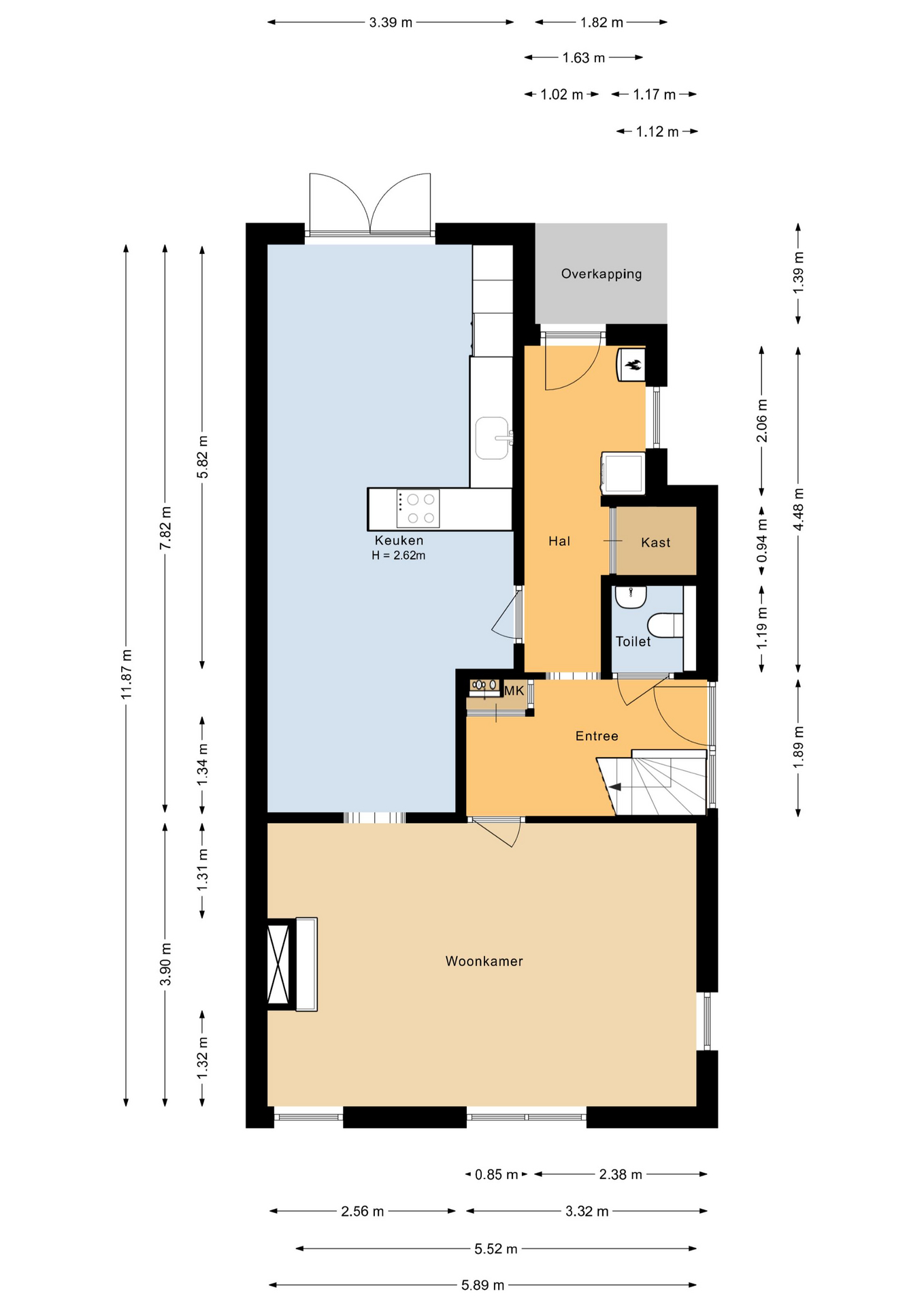 Entree, trapopgang. De woonkamer bevindt zich aan de voorzijde van de woning, De woning is aan de achterzijde uitgebouw waardoor er een riante woonkeuken is ontstaan met inbouwkeuken v.v. de benodigde inbouwapparatuur. Een lichtkoepel in het platte dak zorgt voor extra daglicht in de keuken. Achteringang met vast kast, de opstelling voor de Cv-ketel en een aansluiting voor de wasmachine en droger. Tevens is hier de toiletruimte aanwezig.
