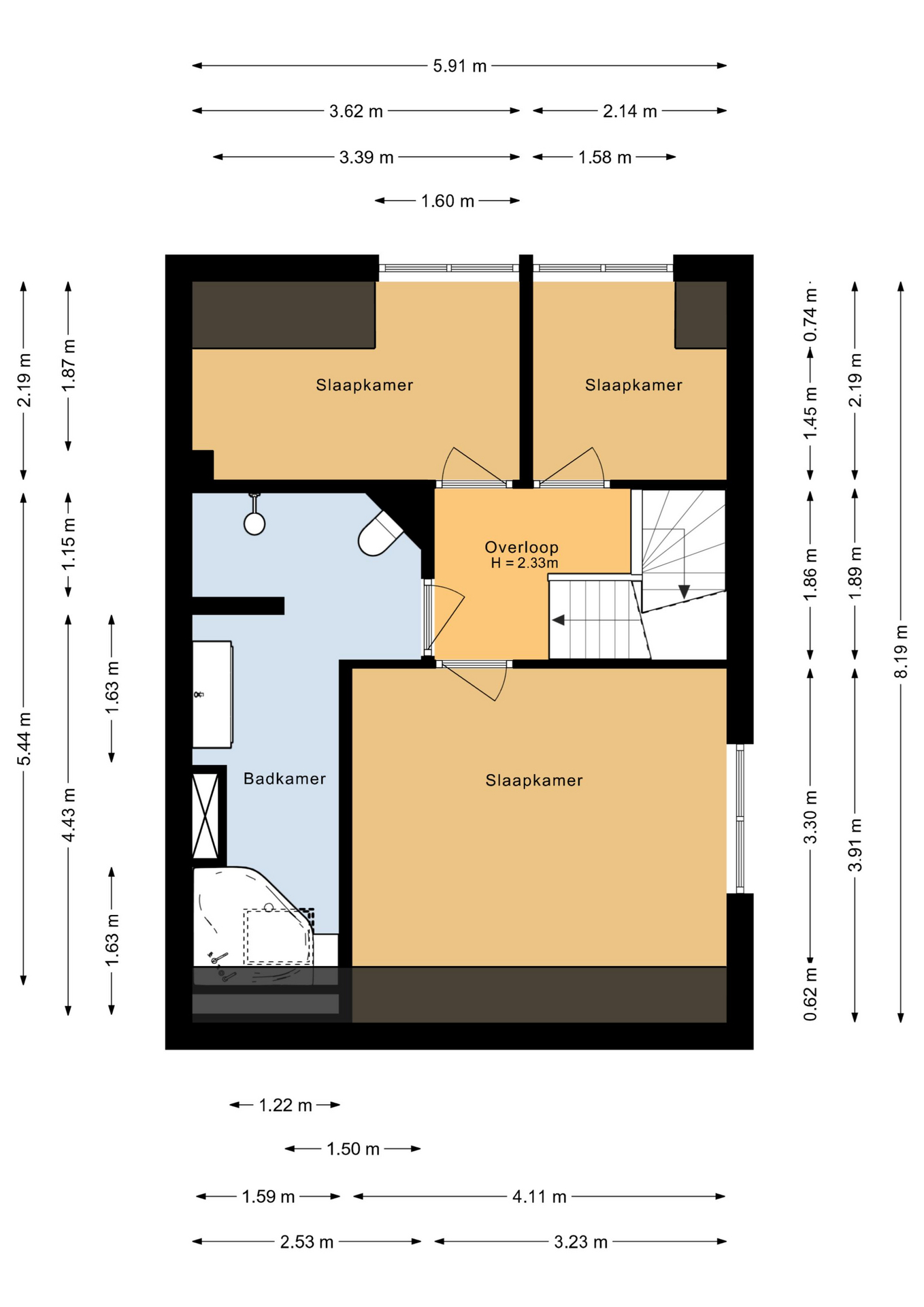 Overloop met toegang naar een ruime ouderslaapkamer aan de voorzijde en twee kleinere slaapkamers aan de achterzijde van de woning, deze twee slaapkamers zijn voorzien van een dakkapel. Ruime badkamer met inloopdouche, wasmeubel, hoekligbad en 2e toilet. Via vaste trap te bereiken..